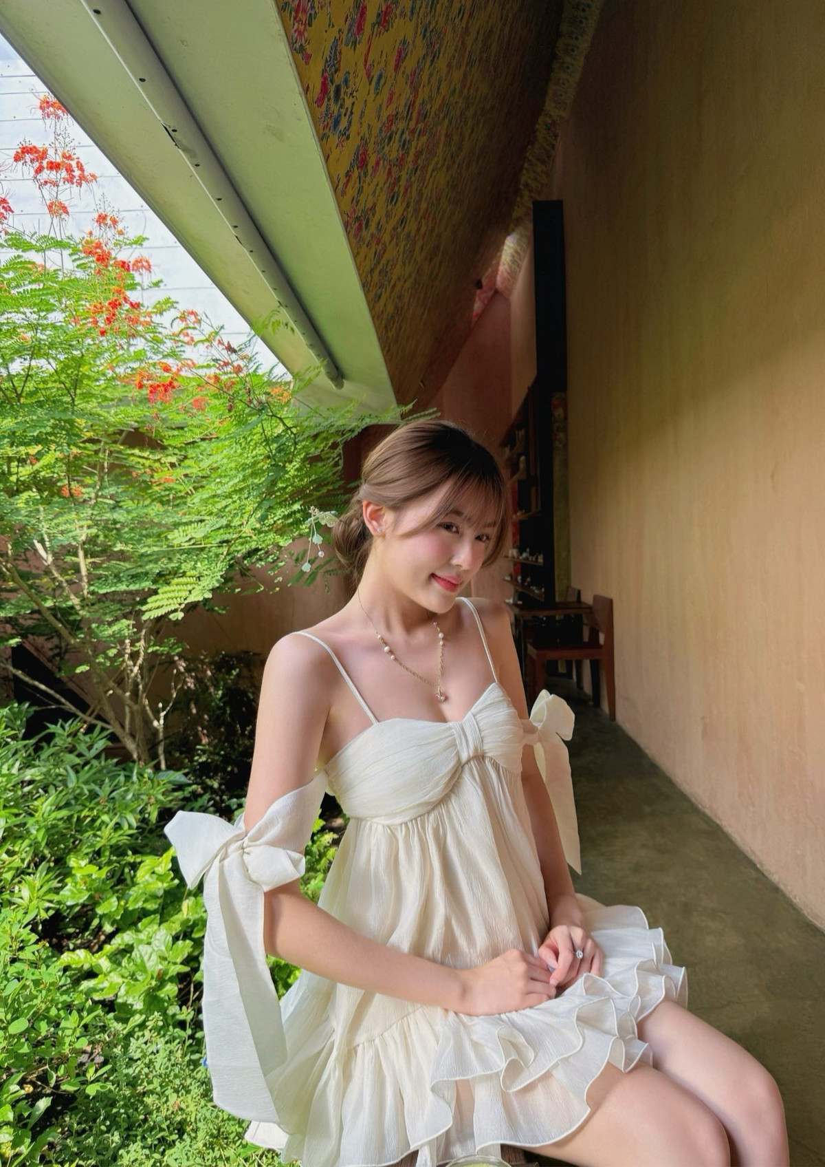 Mỹ Hàn thường chọn những thiết kế váy dáng xòe, váy hai dây buộc nơ, đầm cúp ngực hay váy tay bồng cổ vuông "kinh điển". Những chi tiết như thêu hoa, ren, hoặc tầng váy nhẹ nhàng càng làm tăng thêm vẻ "ngoan xinh yêu".