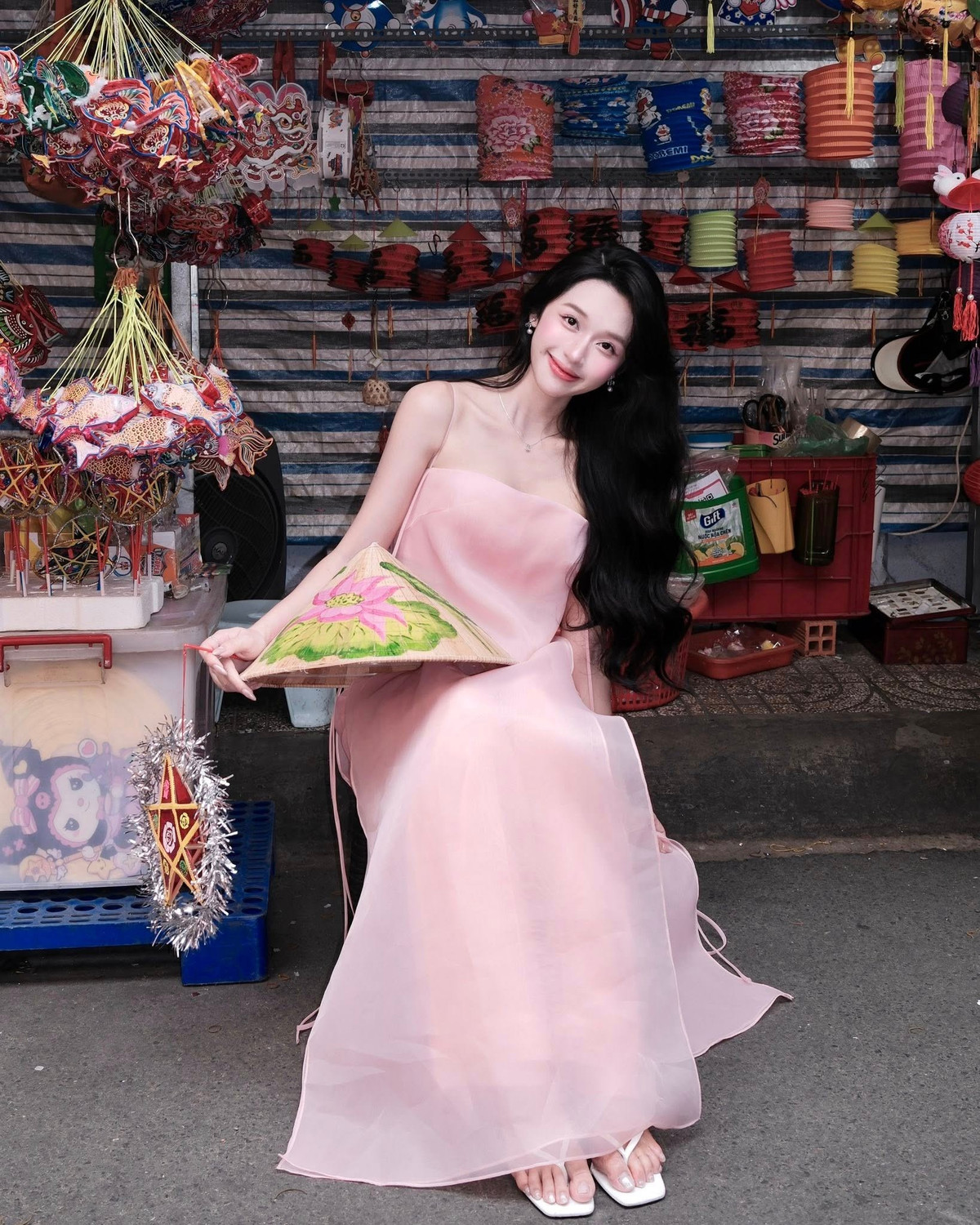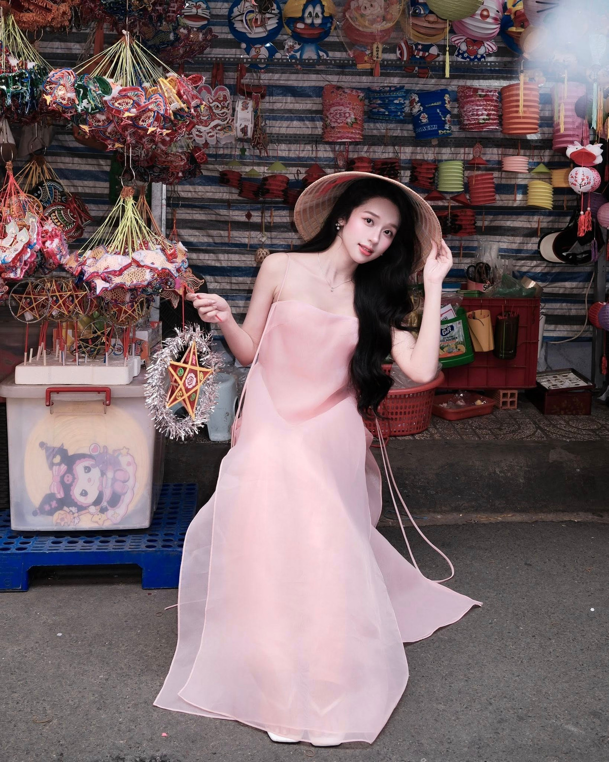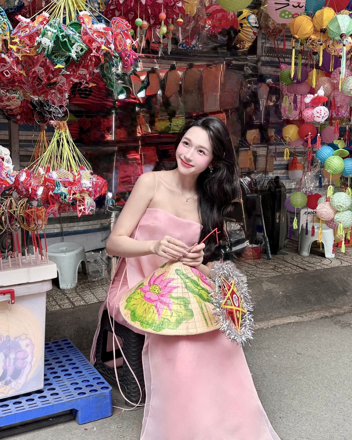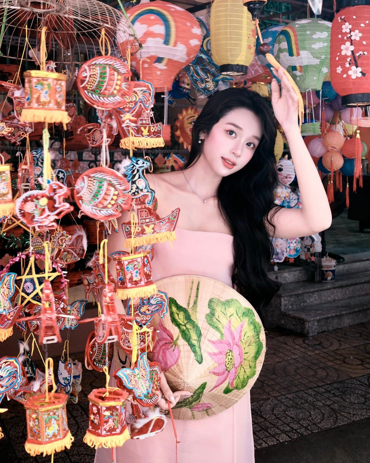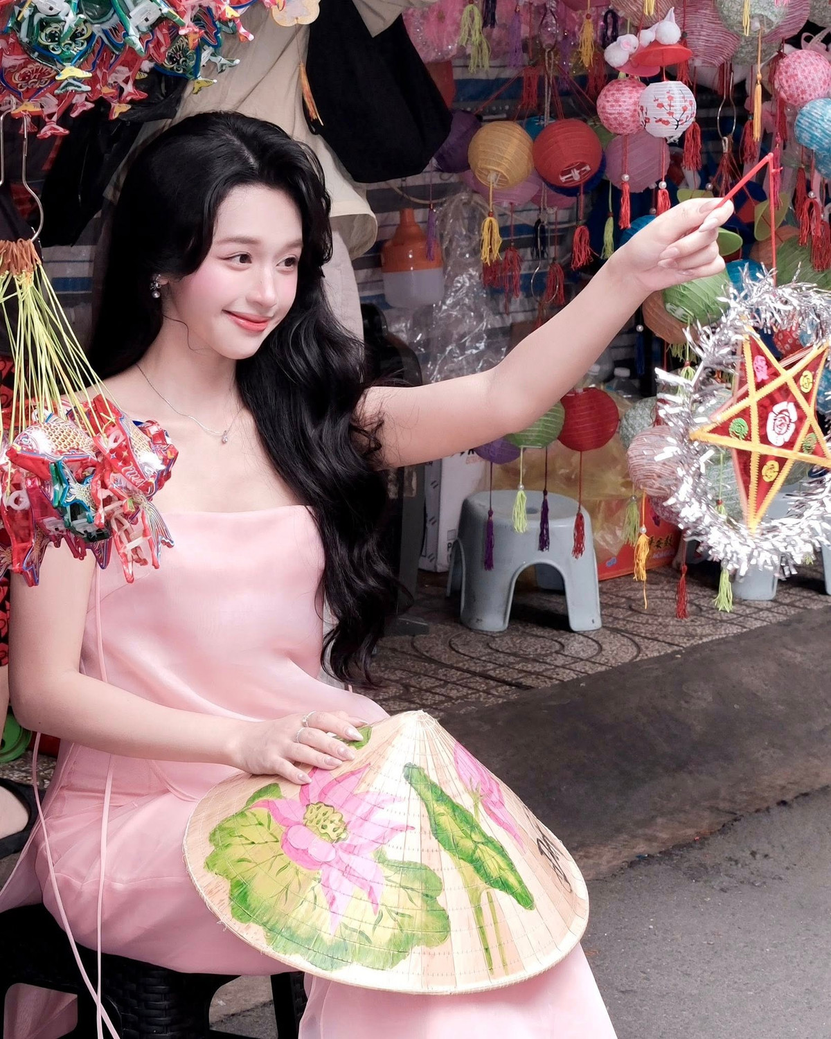 Từ khoảnh khắc dịu dàng nâng nón lá, đến nụ cười rạng rỡ bên chiếc đèn ông sao, hay cái vươn tay mơ màng giữa rừng đèn lồng nhiều màu sắc, cô nàng đã khéo léo truyền tải trọn vẹn không khí ấm áp, hoài niệm của Tết Đoàn Viên. (Ảnh: FBNV)
