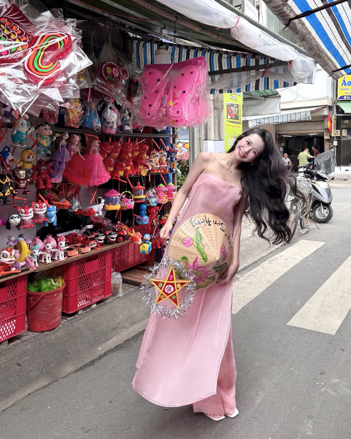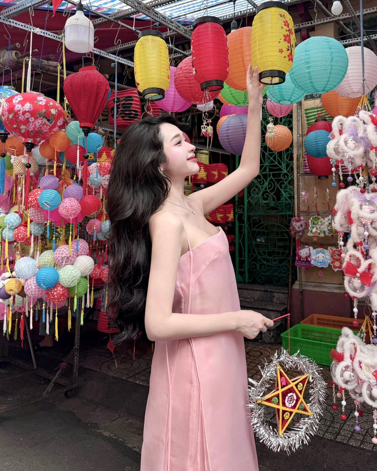 Trong bối cảnh ngập tràn màu sắc của những chiếc đèn lồng truyền thống và hiện đại, Karty Chang xuất hiện như một "nàng thơ" bước ra từ câu chuyện cổ tích. (Ảnh: FBNV)