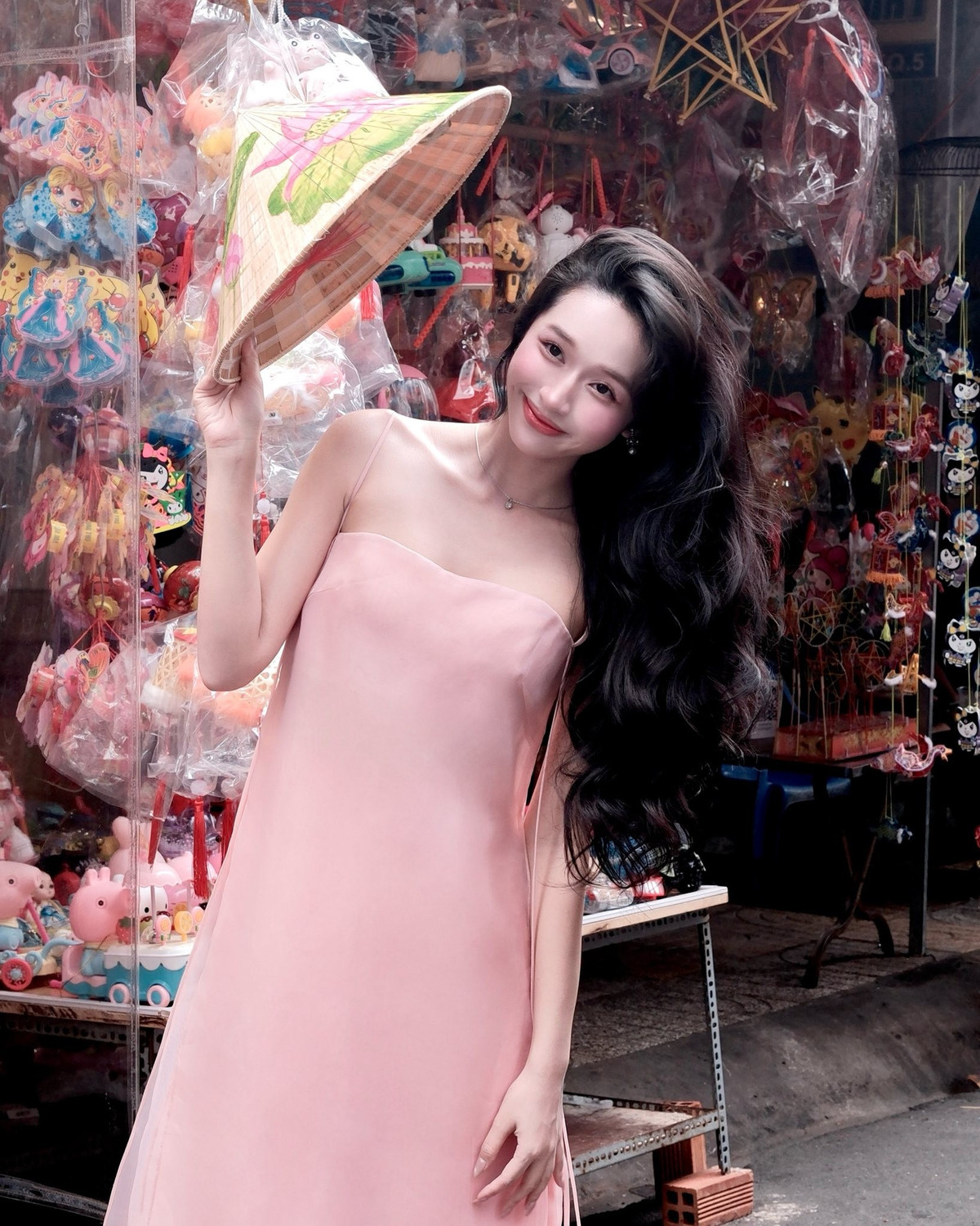 Karty Chang lựa chọn một chiếc váy với phom suông, chất liệu tơ lụa mỏng nhẹ tinh tế, màu hồng phấn ngọt ngào. (Ảnh: FBNV)