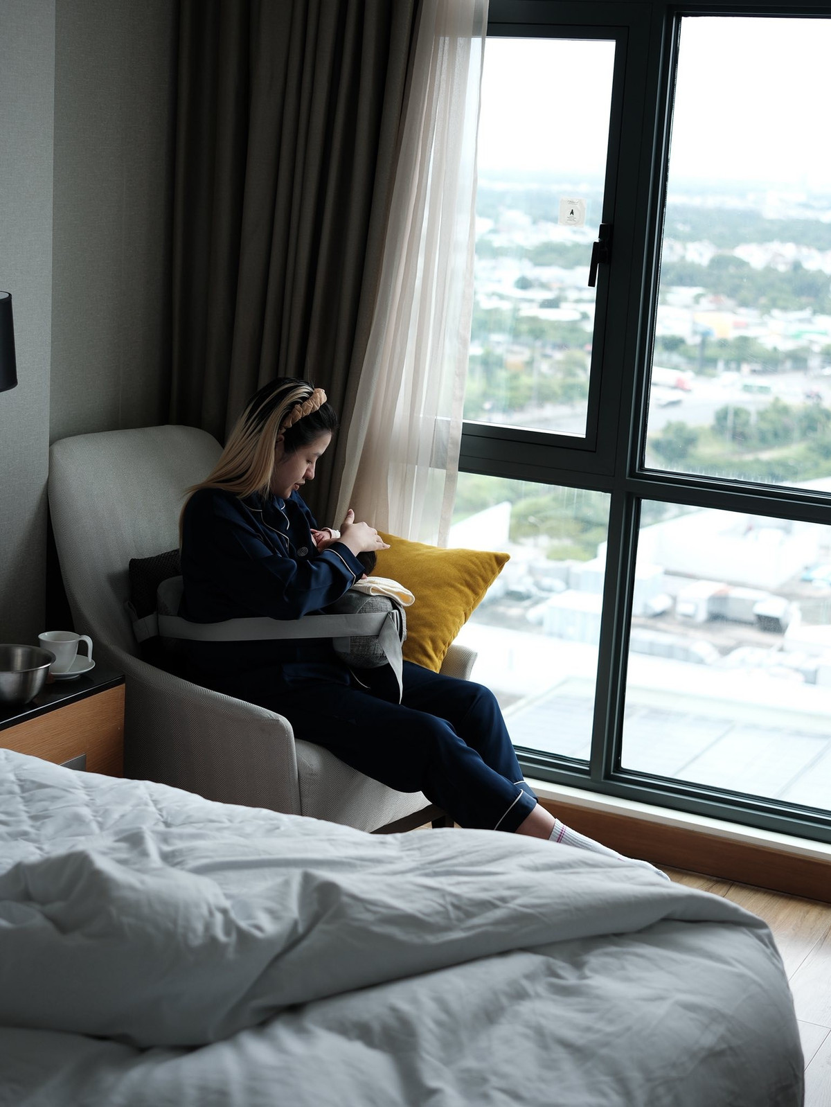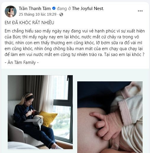 Trong bài viết được đăng kèm hình ảnh cô đang ân cần cho con bú, Thanh Tâm bày tỏ sự ngỡ ngàng trước những giọt nước mắt cứ tự nhiên tuôn rơi: "Em chẳng hiểu sao mấy ngày nay đang vui vẻ hạnh phúc vì sự xuất hiện của Bún; thì mấy ngày nay em lại khóc, nước mắt cứ chảy ra trong vô thức, nhìn con em thấy thương em cũng khóc..."(Ảnh: FBNV)