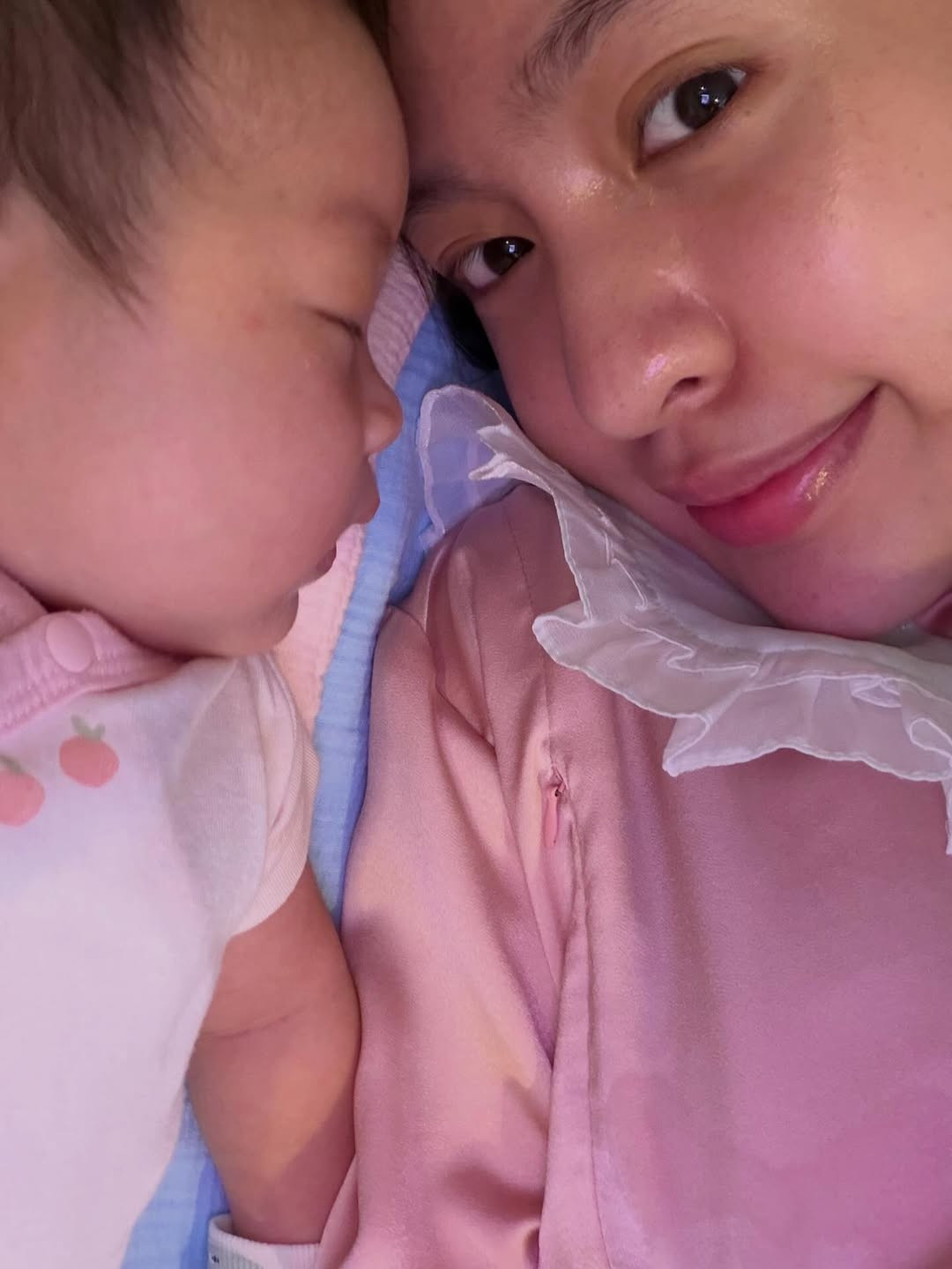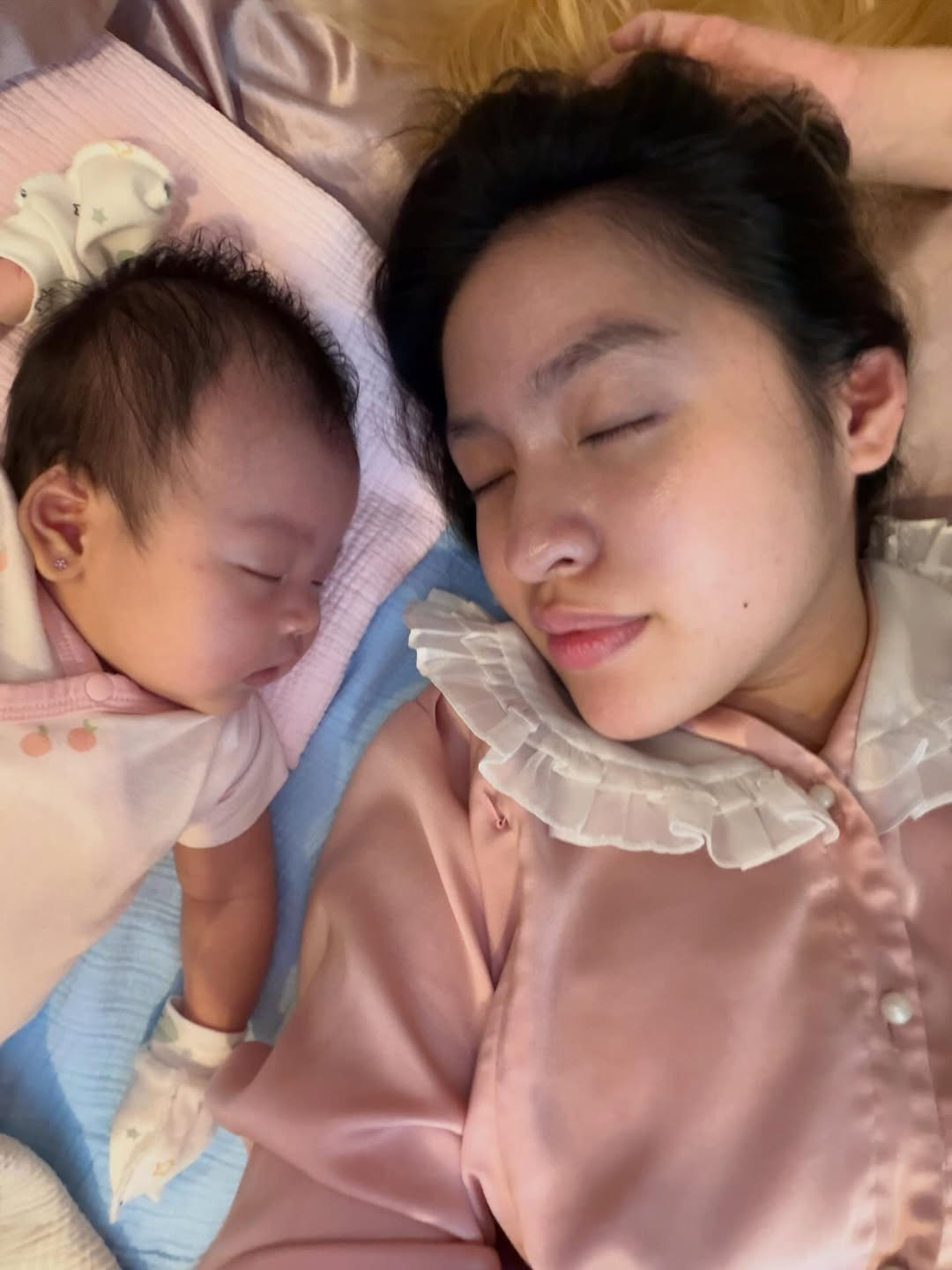 Nụ cười rạng rỡ và ánh mắt trìu mến dành cho con gái cho thấy sự viên mãn và hạnh phúc khi được làm mẹ. Những bức ảnh chụp cận cảnh hai mẹ con lúc nằm ngủ, kề má bên nhau càng làm nổi bật vẻ đẹp tự nhiên của "hot girl trứng rán". (Ảnh: IGNV)