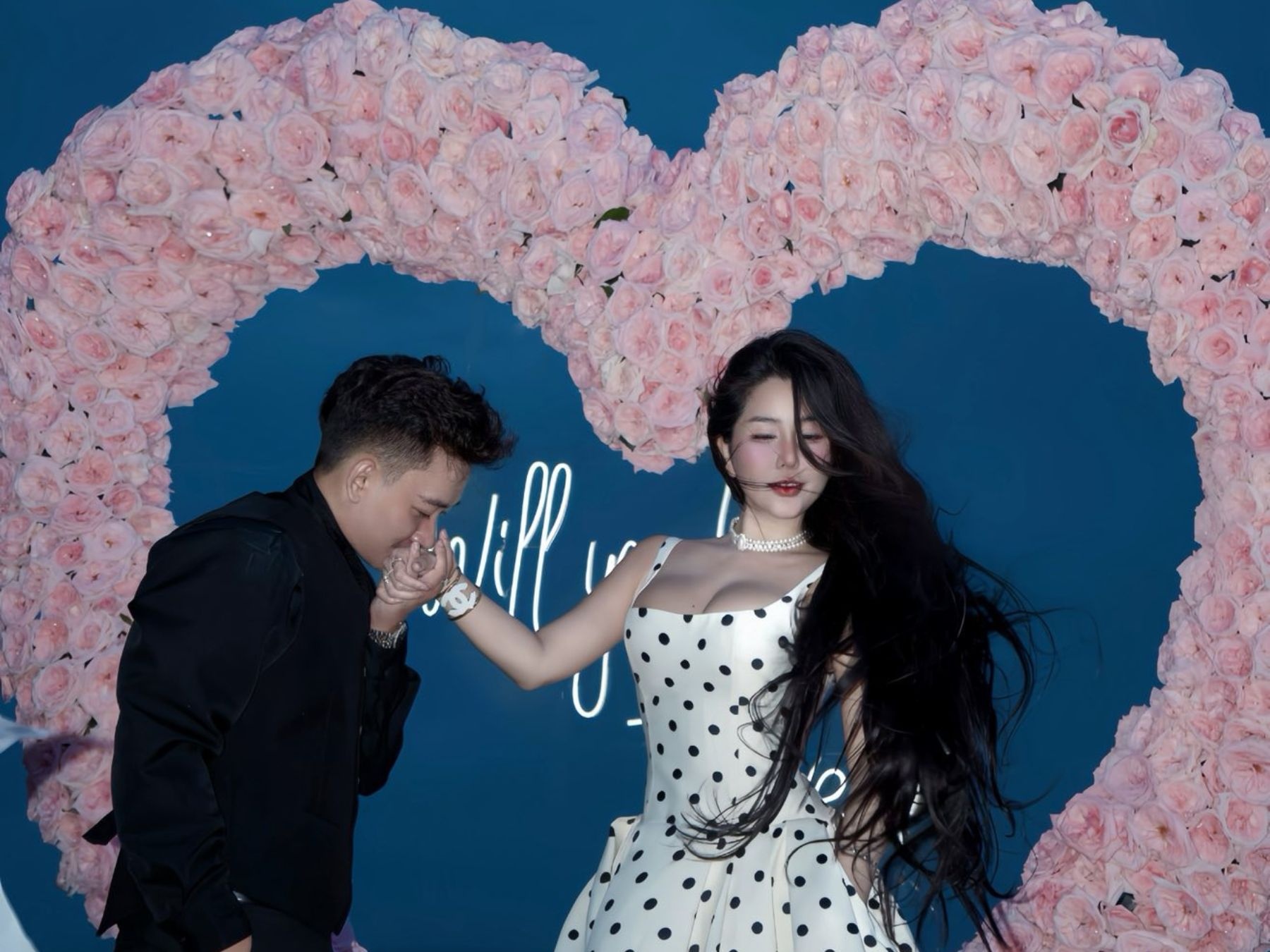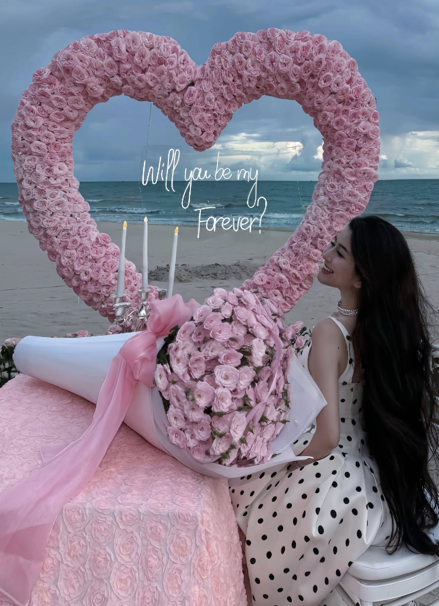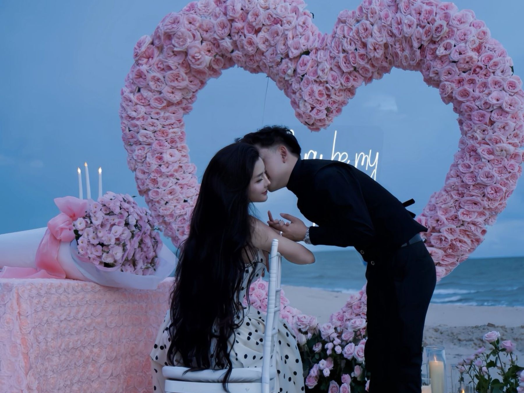 Trong loạt ảnh được chia sẻ, Võ Ngọc Trân diện váy trắng chấm bi cổ điển, mái tóc dài buông xõa, khoe vẻ đẹp dịu dàng, kiêu sa. Bạn trai cô lịch lãm trong vest đen, quỳ gối trao hoa, nắm tay và hôn cô. Không gian được trang trí bằng hàng nghìn đóa hồng pastel xếp thành trái tim khổng lồ hướng ra biển, trên bàn phủ khăn hoa tinh xảo, bó hoa hồng cùng nến trắng lung linh, tạo nên bầu không khí ngọt ngào.