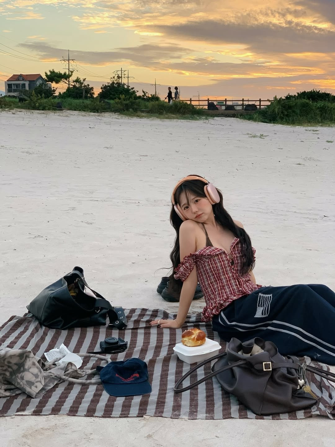Cô nàng diện thiết kế trễ vai, kết hợp với chiếc quần dáng thụng cạp trễ. Đây là cách phối đồ theo hướng thời trang Y2K đang rất thịnh hành. (Ảnh: IG @kisy0729)