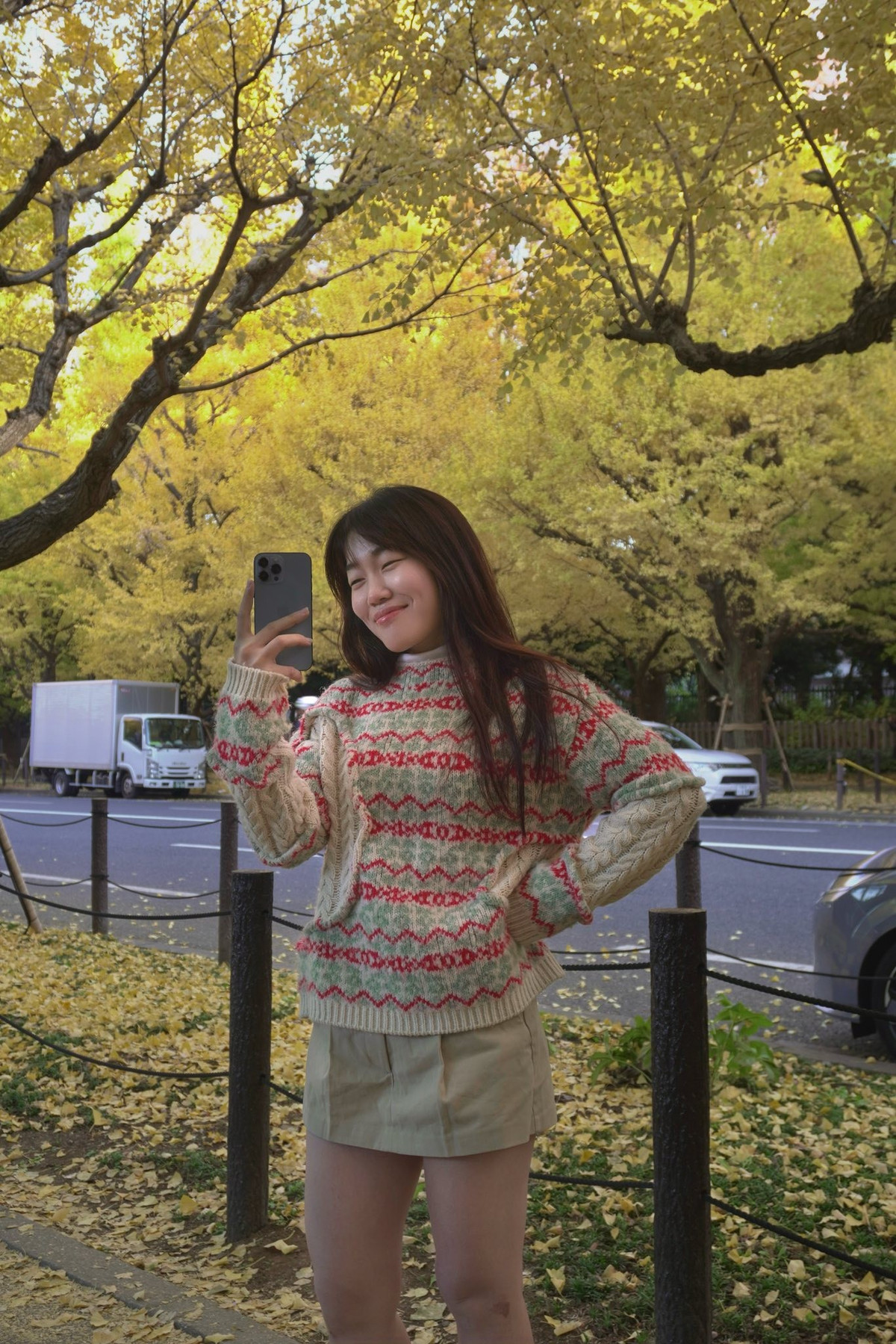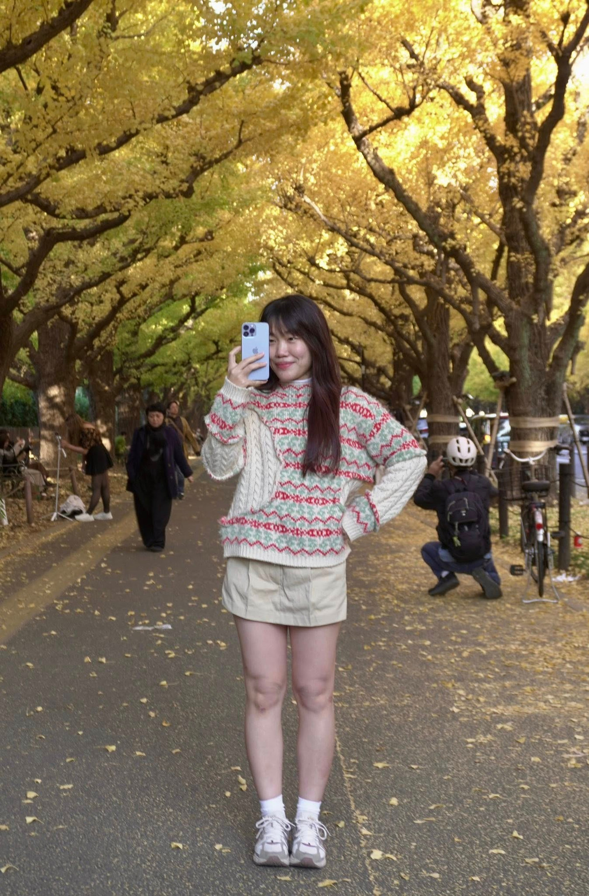 Nàng Tiktoker diện một chiếc áo len dệt kim ấm áp với họa tiết ziczac màu kem, đỏ và xanh mint, kết hợp cùng chân váy ngắn màu be và giày sneaker trắng năng động. Bộ trang phục vừa giữ ấm, vừa trẻ trung, giúp cô nàng nổi bật giữa con đường ngập sắc vàng.