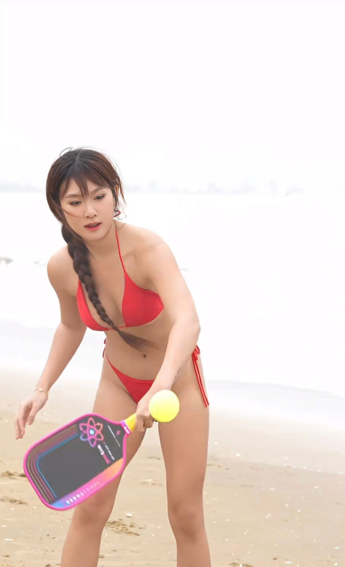 Gần đây nhất, bộ trang phục bikini hai mảnh của Em Kim khi chơi pickleball trên bãi biển vào đầu năm 2026 lại một lần nữa làm dấy lên làn sóng thảo luận. Hotgirl diện set bikini dây mỏng, cắt xẻ táo bạo, với phần trên là áo ngực mỏng và phần dưới cắt cao. Màu đỏ nổi bật giúp Em Kim nổi bật giữa sóng nước, kết hợp với động tác cứu bóng mạnh mẽ. Ảnh chụp màn hình
