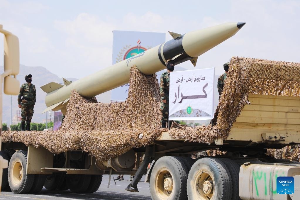 Một tên lửa được trưng bày trong cuộc duyệt binh do lực lượng Houthi tổ chức tại Sanaa, Yemen, ngày 21/9/2022. Lực lượng Houthi tại Yemen đã giới thiệu các tên lửa đạn đạo “tầm xa” trong cuộc duyệt binh diễn ra tại Sanaa vào ngày này. Ảnh: Xinhua