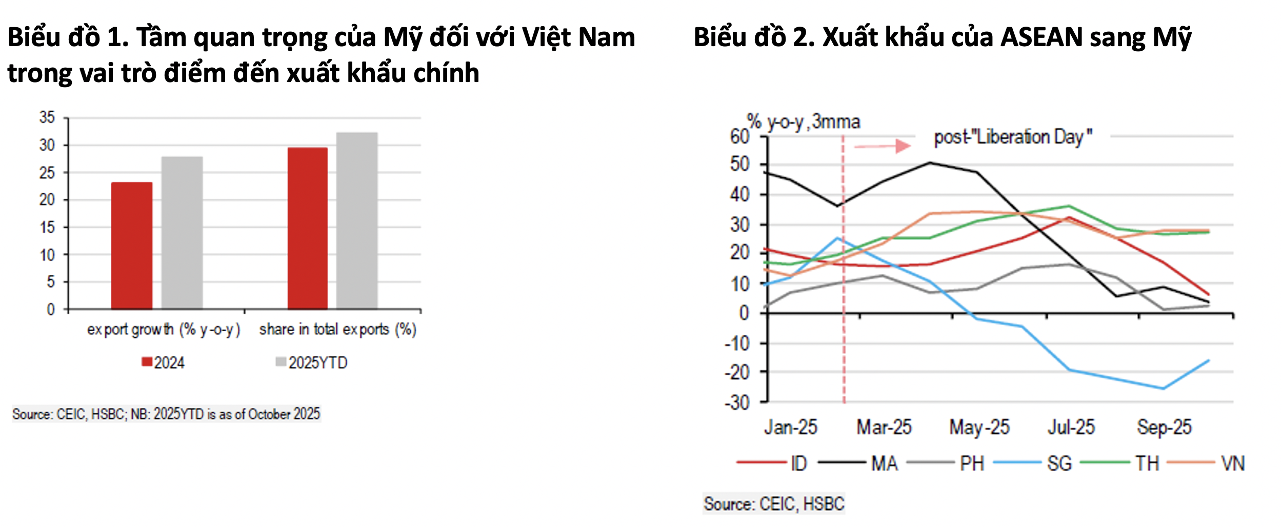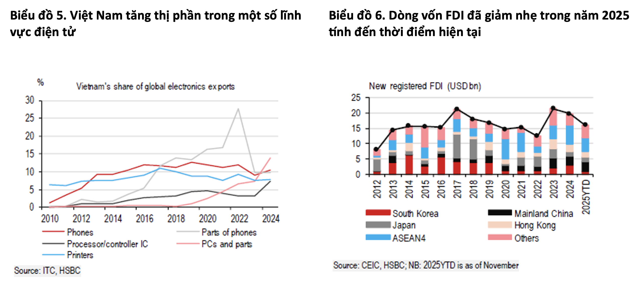 "Tăng trưởng xuất khẩu của Việt Nam thậm chí còn nhanh hơn, bình quân năm 2025 (tới hiện tại) đạt mức 28% so với cùng kỳ năm trước. Đúng là mức tăng này đạt được một phần nhờ hoạt động đẩy nhanh đơn hàng đặt trước (frontloading), đặc biệt là trong quý II khi các doanh nghiệp xuất khẩu đổ xô xuất khẩu hàng hóa, nhưng tác động của xu hướng này chưa giảm nhanh như dự đoán ban đầu”, HSBC cho biết.