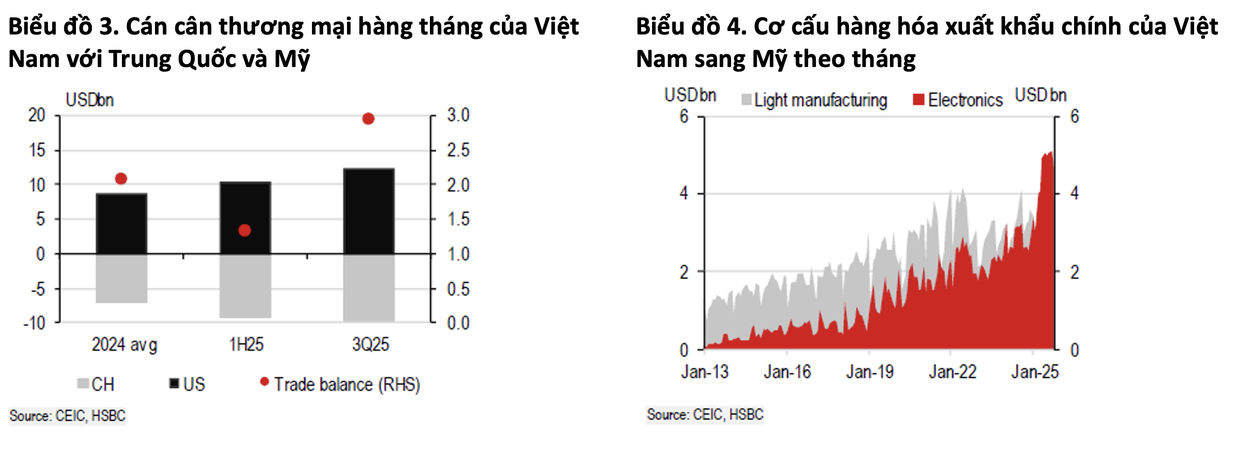 Tuy nhiên, Việt Nam phụ thuộc nhiều vào Mỹ không chỉ trong lĩnh vực xuất khẩu mà còn ở cán cân thương mại. Mỹ luôn là nguồn đóng góp chủ yếu cho thặng dư thương mại của Việt Nam. Sau khi thặng dư thương mại hàng tháng giảm gần một nửa xuống còn 1,3 tỷ USD trong nửa đầu năm 2025 so với năm 2024, con số này đã tăng lên 3 tỷ USD trong quý III/2025. Phần lớn sự bùng nổ thương mại với Mỹ đến từ lượng hàng điện tử xuất khẩu được duy trì ổn định ở mức cao.