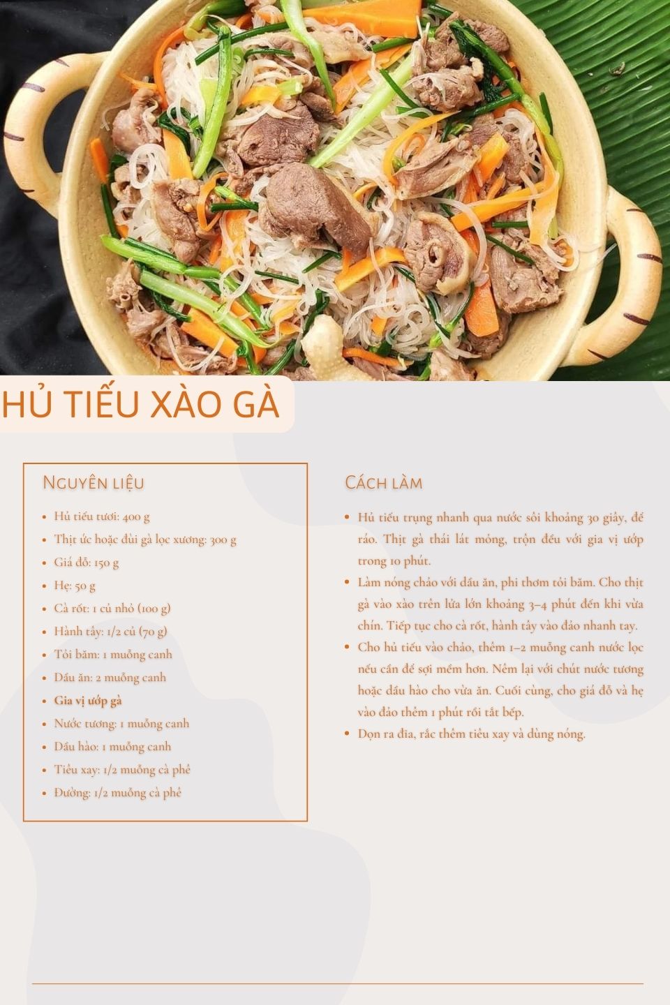 Cách xào cũng là yếu tố quyết định độ ngon, khi thịt gà được xào trước trên lửa lớn để chín nhanh và giữ độ mềm. Khi gà vừa chín tới, tiếp tục cho rau củ vào đảo nhanh tay, sau đó mới thêm hủ tiếu. Việc đảo đều và nhẹ tay giúp sợi hủ tiếu tơi ra, không bị vón cục. Lửa lớn và thời gian xào ngắn giúp giữ lại độ giòn của rau cũng như vị ngọt tự nhiên của thịt.