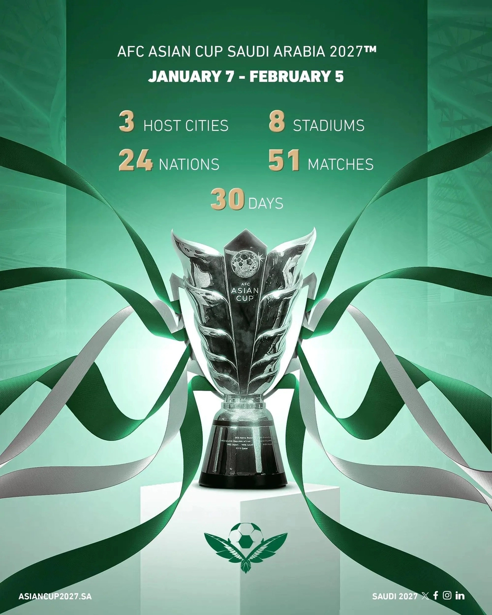 Asian Cup 2027 sẽ diễn ra từ ngày 7/1 đến 5/2/2027 tại ba thành phố gồm Riyadh, Jeddah và Al Khobar. Sân King Fahd Sports City tại thủ đô Riyadh là nơi tổ chức trận khai mạc có sự góp mặt của đội chủ nhà Saudi Arabia (3 lần vô địch châu Á).