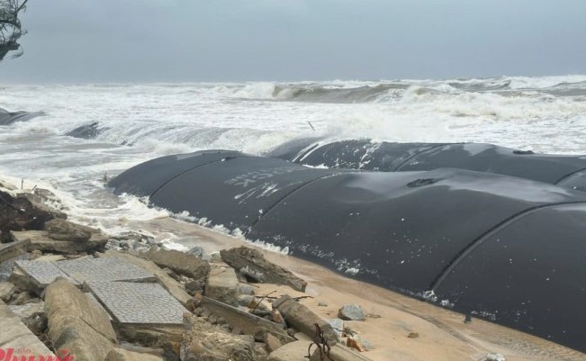 Ghi nhận của phóng viên, triều cường dâng cao kèm sóng lớn đã ăn sâu vào gần chân móng tuyến đường khu vực Hải Bình, xã Phú Lộc làm hư hỏng hệ thống rọ đá với chiều dài khoảng 30m.