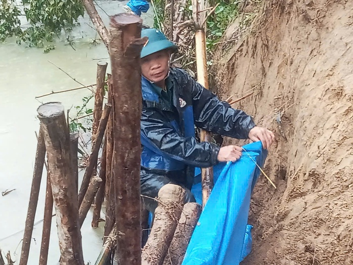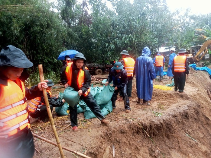 Lực lượng của chính quyền địa phương, bộ đội khẩn trương gia cố khu vực sạt lở bờ sông ở xã Chân Mây - Lăng Cô.