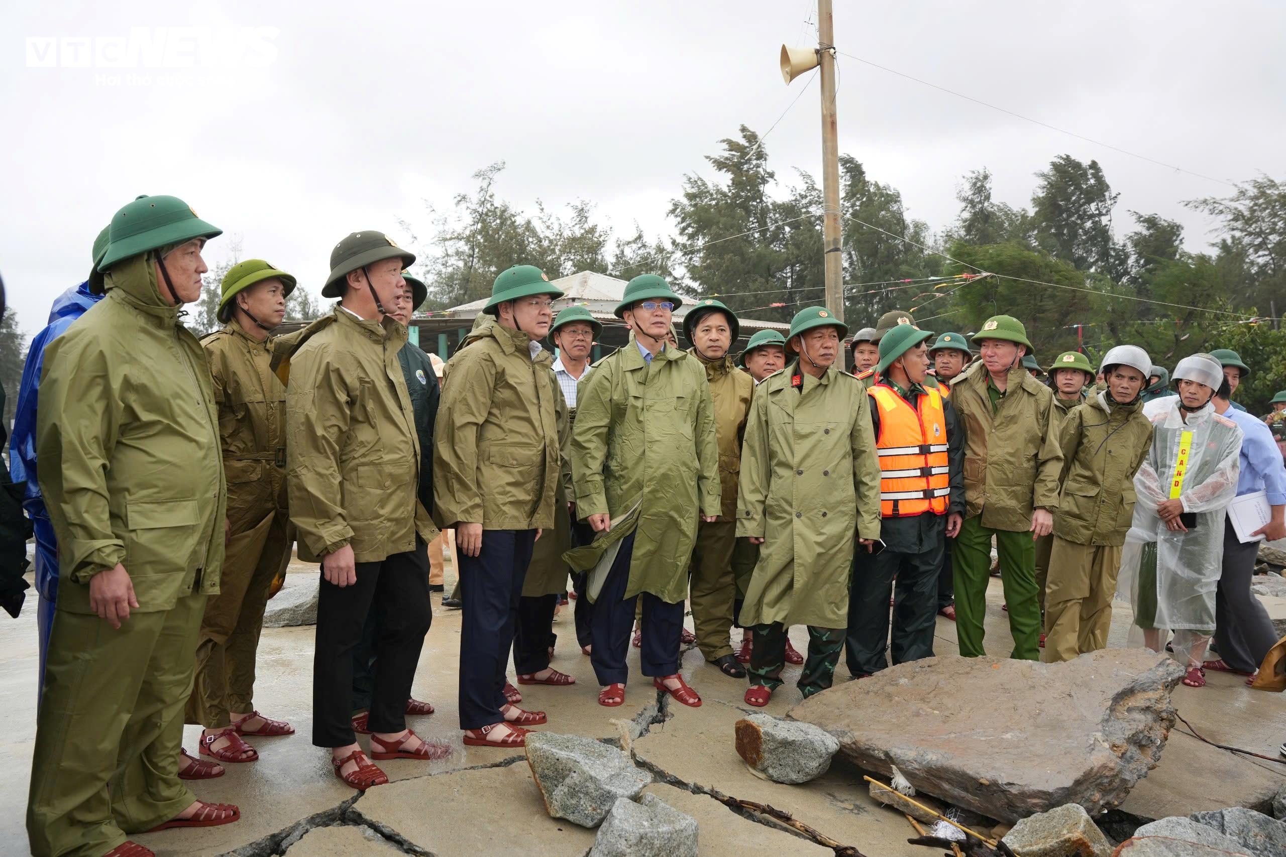Bí thư Thành ủy và Chủ tịch UBND TP Huế và đoàn công tác kiểm tra tại bờ biển Thuận An (TP Huế) - nơi vừa bị tàn phá bởi bão số 10 (bualoi). (Ảnh: Ngọc Minh)