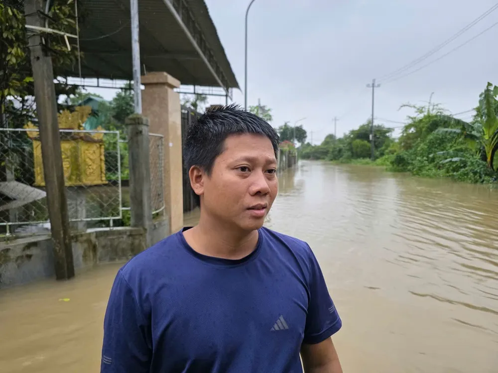 Trời cứ mưa, nước lũ cứ về làm anh Huynh chỉ biết đừng nhìn bất lực. Ảnh: MINH TRƯỜNG.