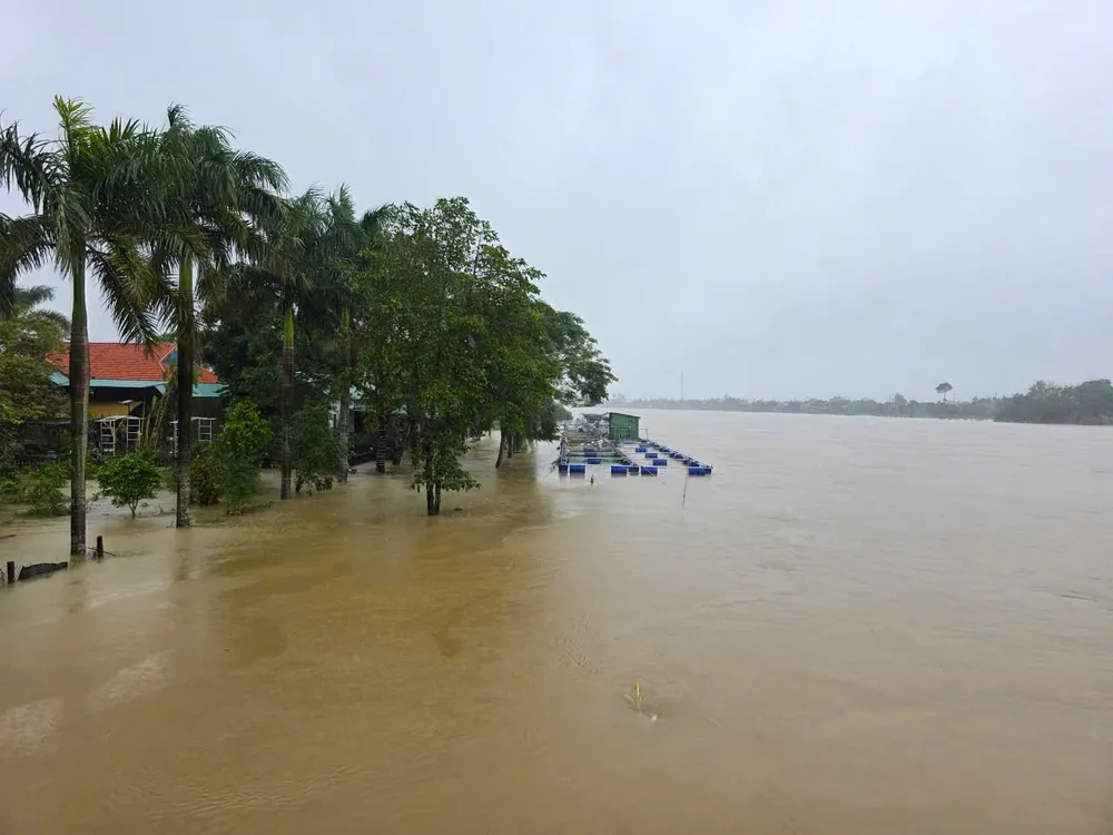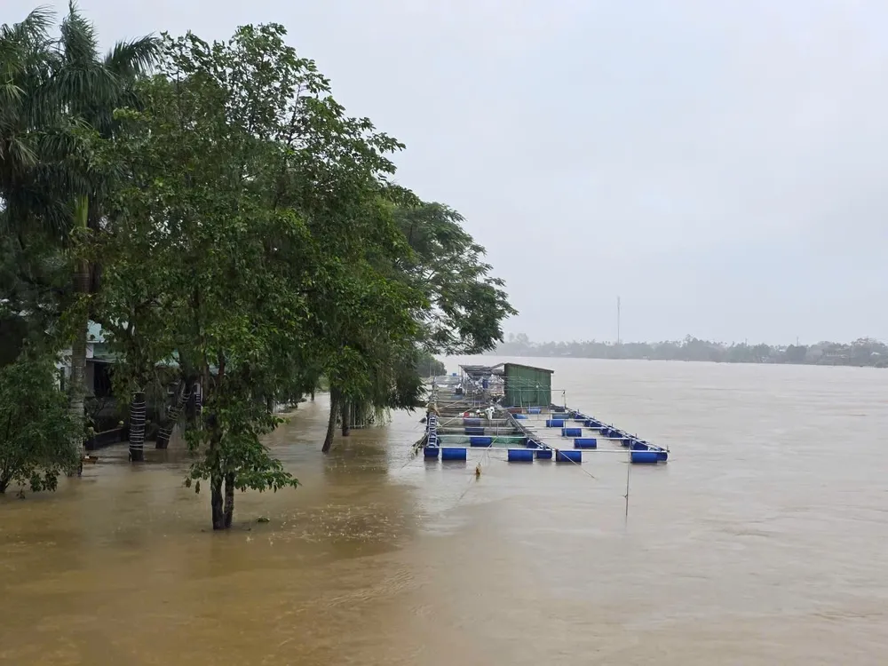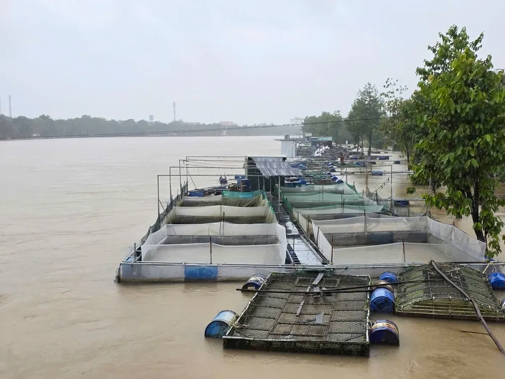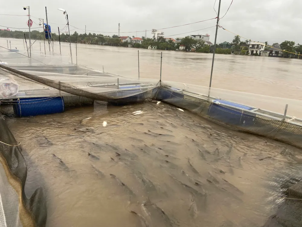 Nước lũ chảy xiết đe dọa hàng trăm lồng bè nuôi cá trên sông Bồ.