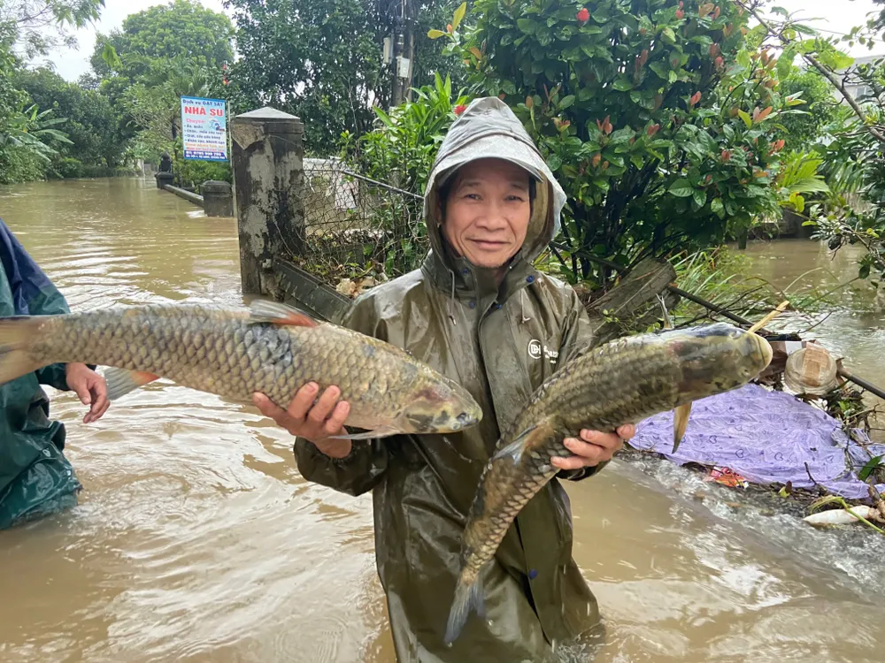 “Nhà em nuôi 3 lồng bè cá trắm, nay cá mỗi con nặng khoảng 3 đến 3kg nên cũng được 6 đến 7 tấn rồi. Từ qua đến giờ chết 30% rồi anh ạ. Nước mà lên như này tiếp thì sợ nó chết hết. Không biết phải làm sao bây giờ”, anh Quyết thở dài. Ảnh: MINH TRƯỜNG.