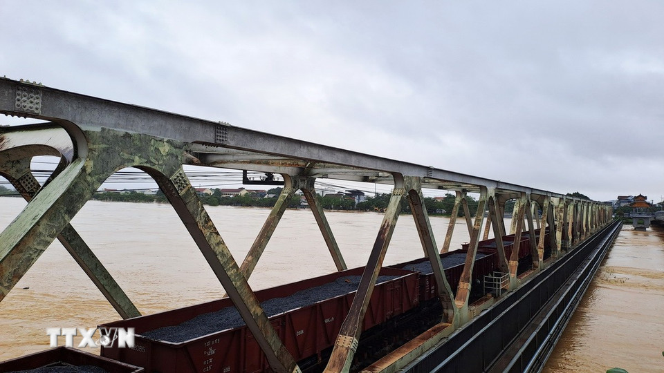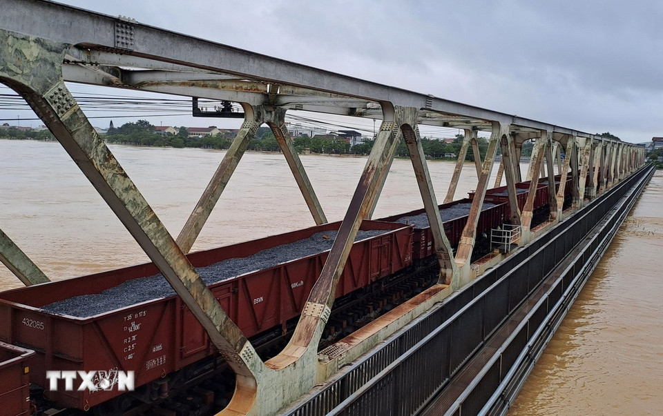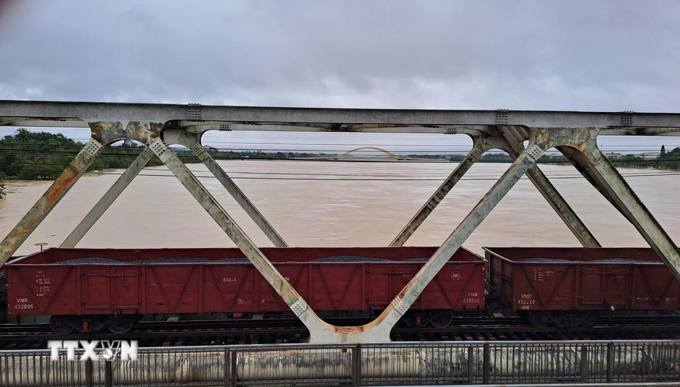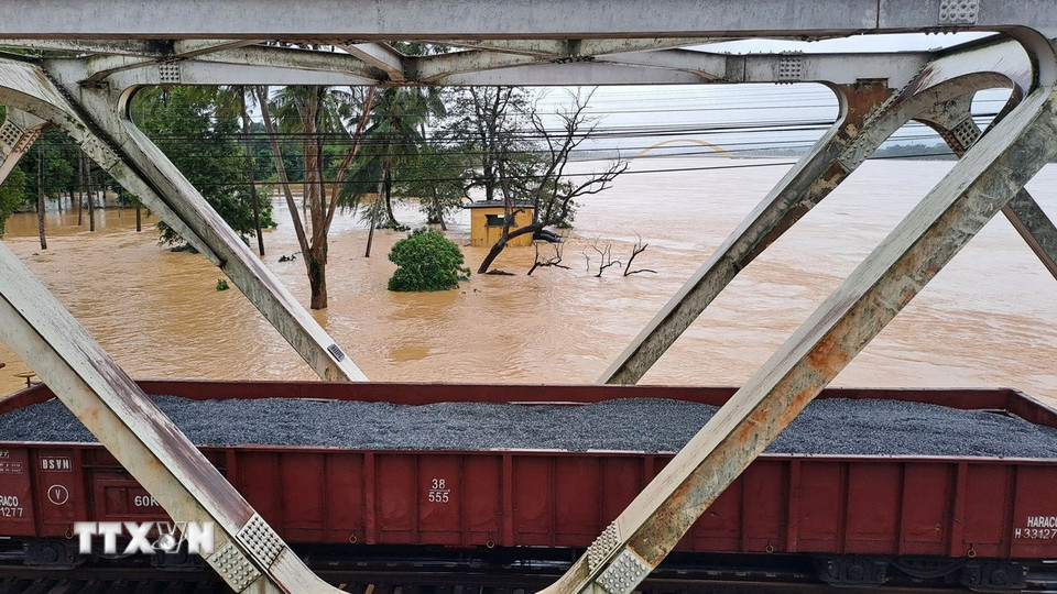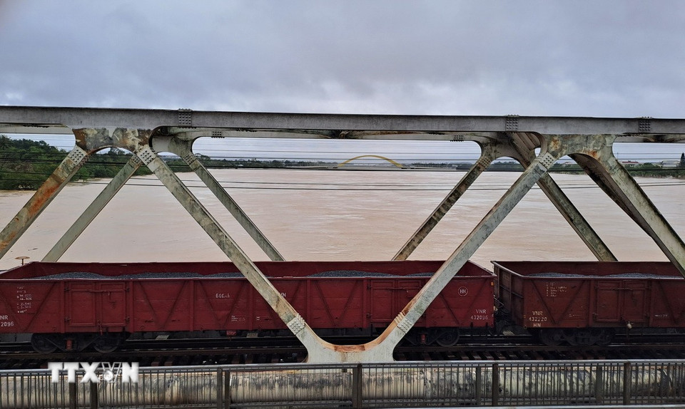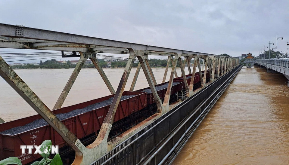 Toa xe lửa chở đá dừng trên cầu đường sắt Bạch Hổ bắc qua sông Hương, thành phố Huế để gia tải ứng phó với lũ lớn. (Ảnh: Nguyên Lý/TTXVN)