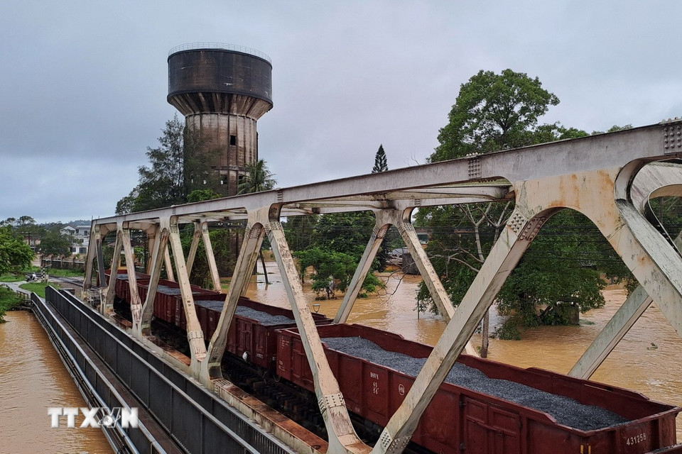 Những toa xe lửa chở đá dừng trên cầu đường sắt Bạch Hổ bắc qua sông Hương, thành phố Huế để gia tải ứng phó với lũ lớn. (Ảnh: Nguyên Lý/TTXVN)
