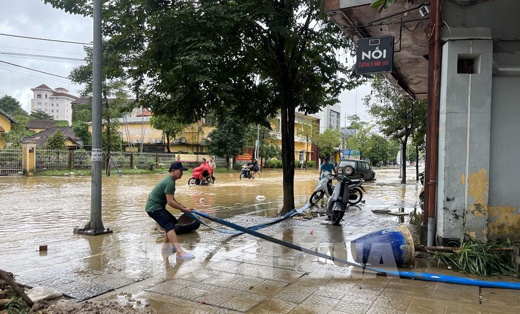 Nhân viên công ty cây xanh tích cực dọn vệ sinh tại khu vực ngập lụt. Ảnh: Văn Dũng-TTXVN