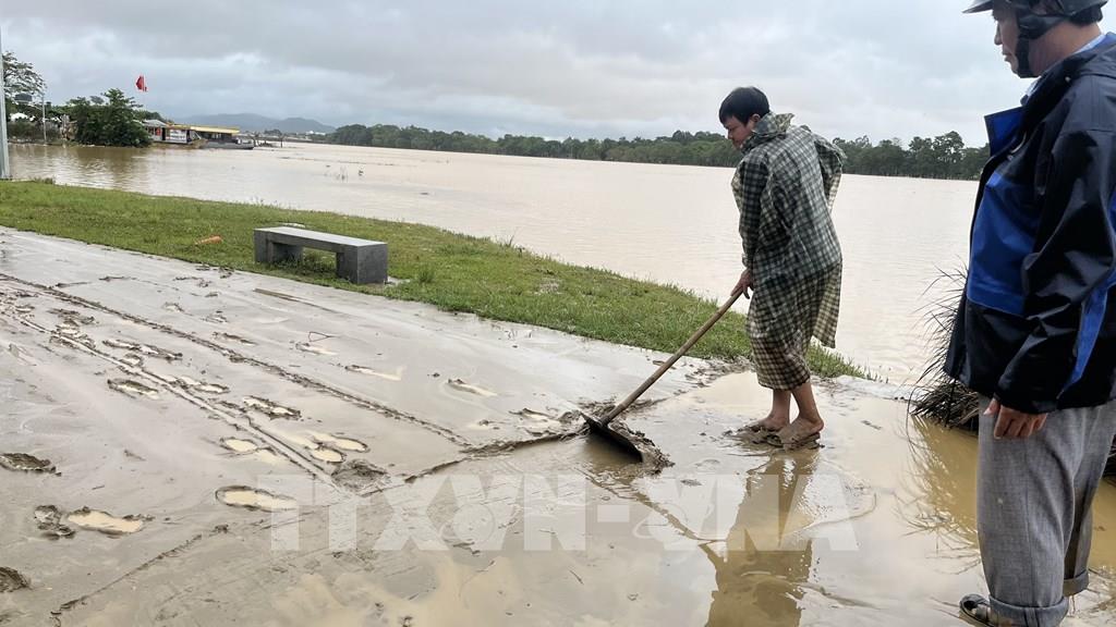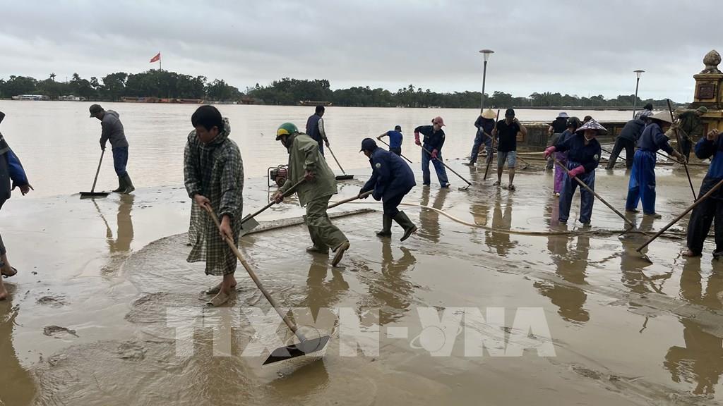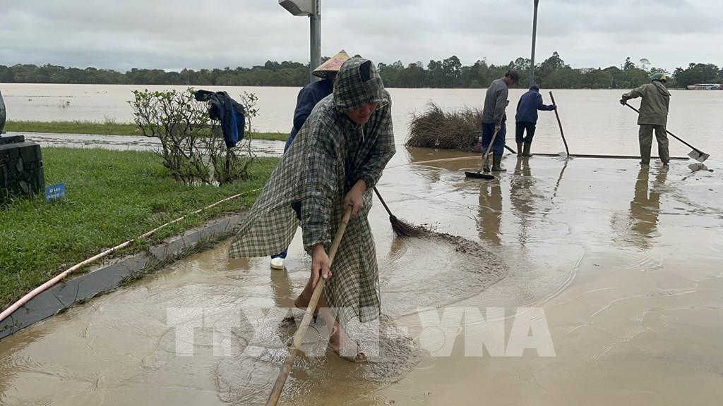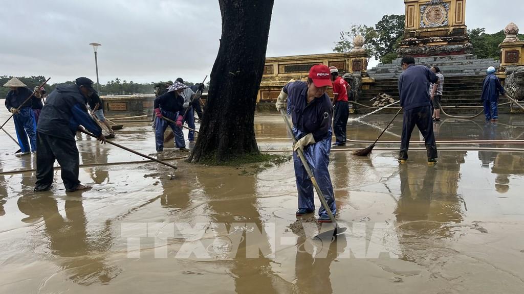 Người dân dọn vệ sinh sau khi nước lũ rút dần trên một số tuyến đường ở thành phố Huế. Ảnh: Văn Dũng-TTXVN