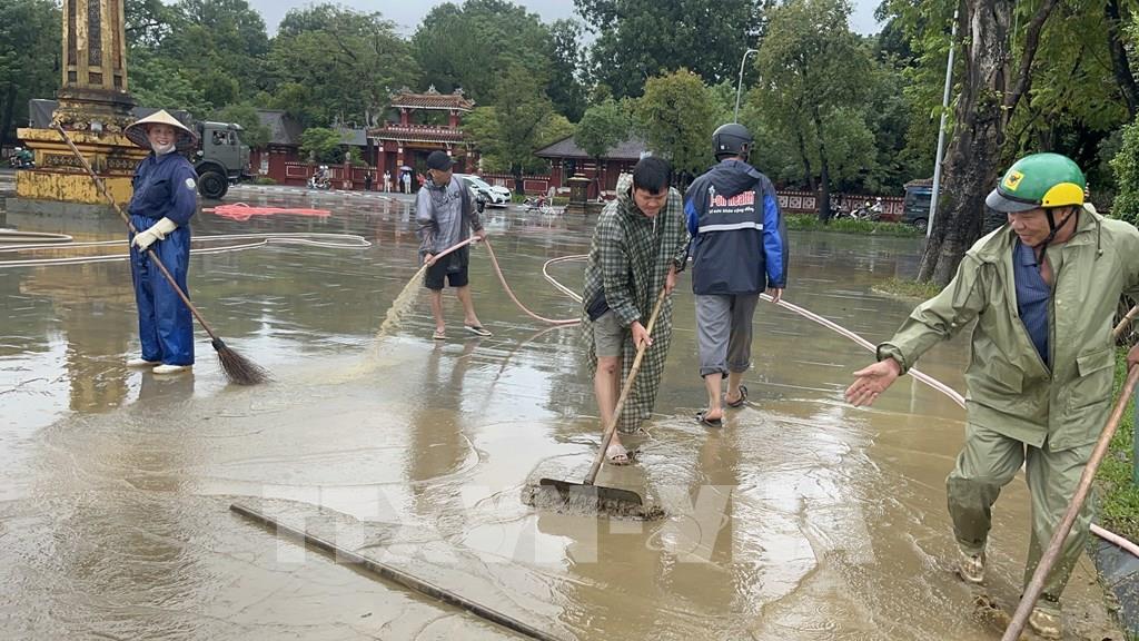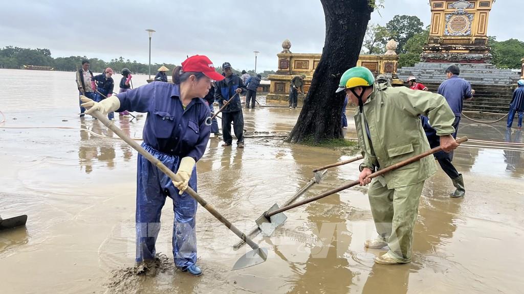 Sáng 30/10/2025, mực nước trên sông Hương và sông Bồ ở Huế đã hạ, nước lũ trên các tuyến đường chính của thành phố Huế bắt đầu rút. Để bảo vệ môi trường sau lụt, người dân, chính quyền đang tích cực tăng cường lực lượng để dọn vệ sinh.