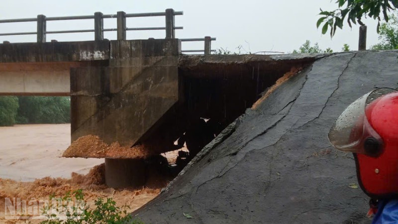 Một chiếc cầu bị nước lũ làm sụt mố ở xã Khe Tre.