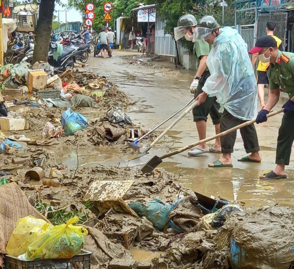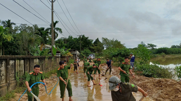 Công an cơ sở dọn dẹp vệ sinh sau khi nước lũ rút.