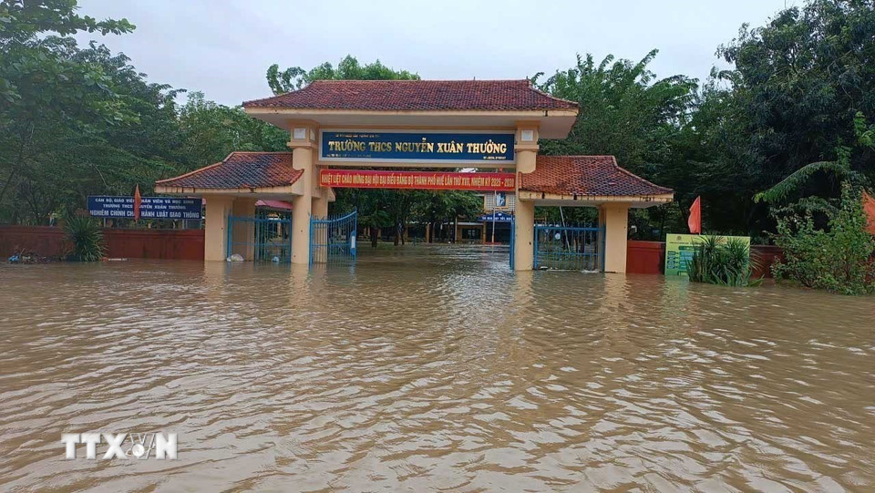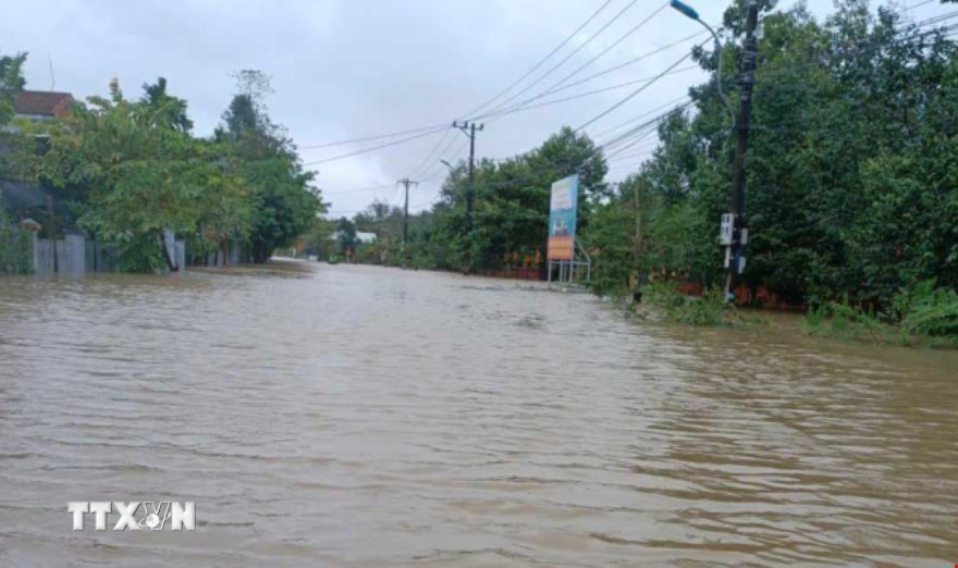 Đường DT8B về phường Kim Trà vẫn còn ngập sâu trong nước. (Ảnh: Hải Âu/TTXVN)