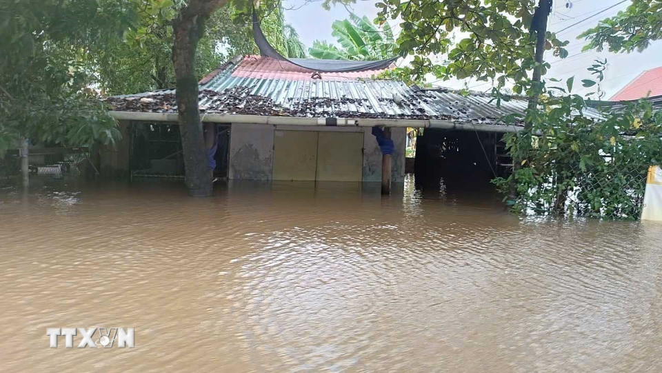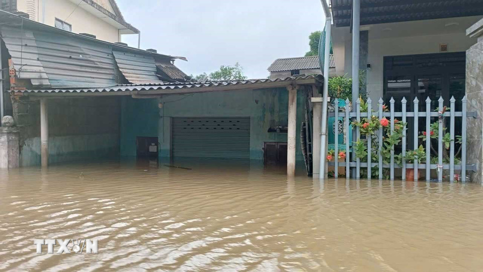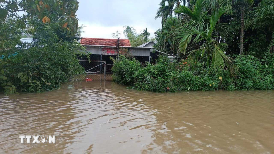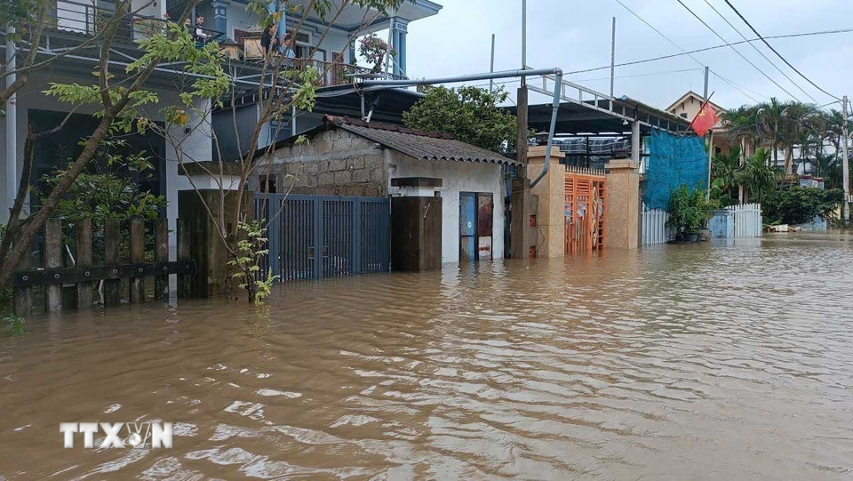 Khu dân cư Hương Toàn, phường Kim Trà, vẫn còn ngập sâu trong nước. (Ảnh: Hải Âu/TTXVN)