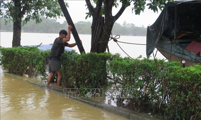 Người dân thành phố Huế gia cố thuyền để tránh bị lũ cuốn trôi, khi lũ trên sông Hương dâng cao sáng 17/11.