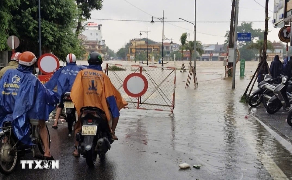 Nhiều tuyến đường Trung tâm Huế bị ngập sâu. (Ảnh: Văn Dũng/TTXVN)