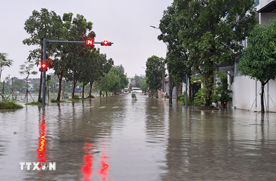 Đường Nguyễn Thị Định, phường Thủy Xuân, thành phố Huế bị ngập sáng 27/10. (Ảnh: Nguyên Lý/TTXVN)