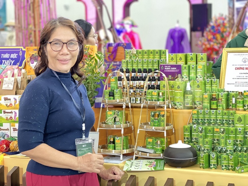 Bà Trần Thị Xuân Đài, chủ hộ kinh doanh tinh dầu Rubis Farm mang đến Hội chợ Mùa Thu 2025 nhiều sản phẩm tinh dầu đặc trưng của vùng đất cố đô, gồm tinh dầu tràm, tinh dầu sả, tinh dầu bưởi và tinh dầu quế hồi. "Đây là sản phẩm được làm từ tâm huyết của gia đình, từ vùng nguyên liệu sạch nên tôi rất tự tin khi giới thiệu đến người tiêu dùng", bà nói.