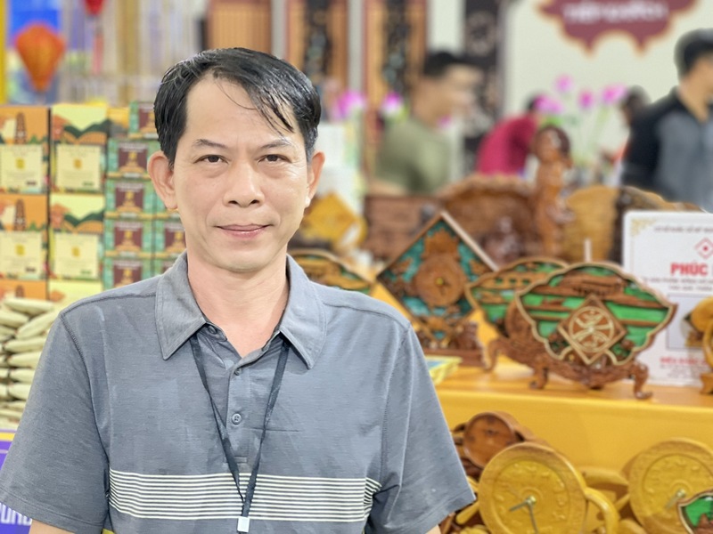 Nghệ nhân Trần Văn Ngọ, cơ sở điêu khắc gỗ mỹ nghệ Phúc Mai, chia sẻ niềm vinh dự khi được tham gia hội chợ. Ông coi đây là dịp lớn để quảng bá sản phẩm truyền thống quê hương đến đông đảo khách hàng trong và ngoài nước.