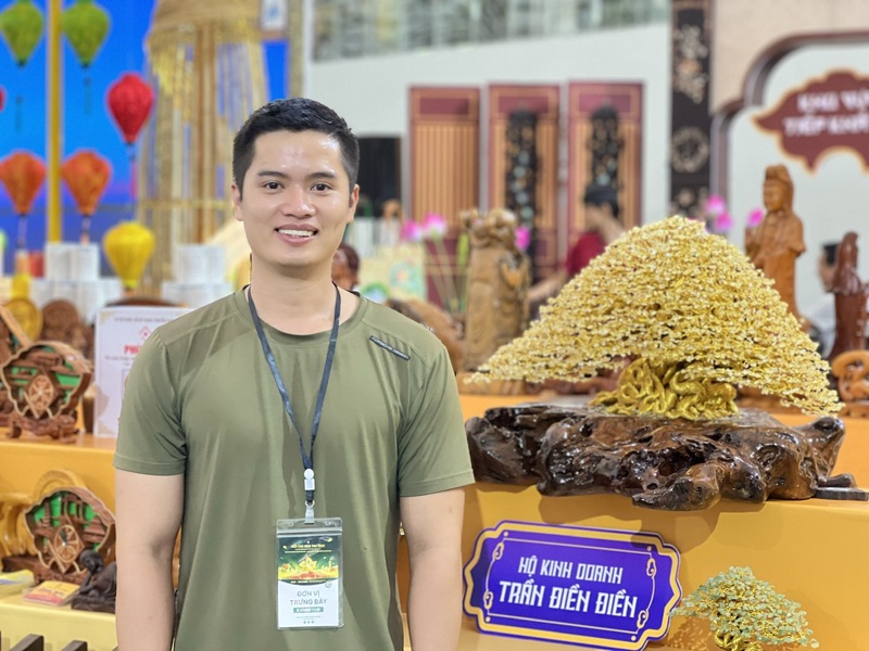 Là một gương mặt trẻ trong lĩnh vực thủ công mỹ nghệ, anh Trần Điền Điền mang đến hội chợ những sản phẩm bonsai dây đồng kết hợp đá quý tự nhiên, được chế tác thủ công hoàn toàn. Anh xem hội chợ là cơ hội quan trọng để đưa các sản phẩm ra thị trường rộng hơn, kết nối với các nhà phân phối, đơn vị kinh doanh và khách hàng tiềm năng.