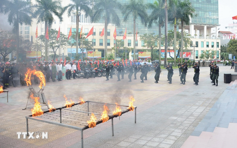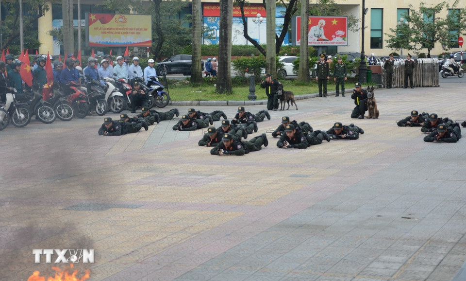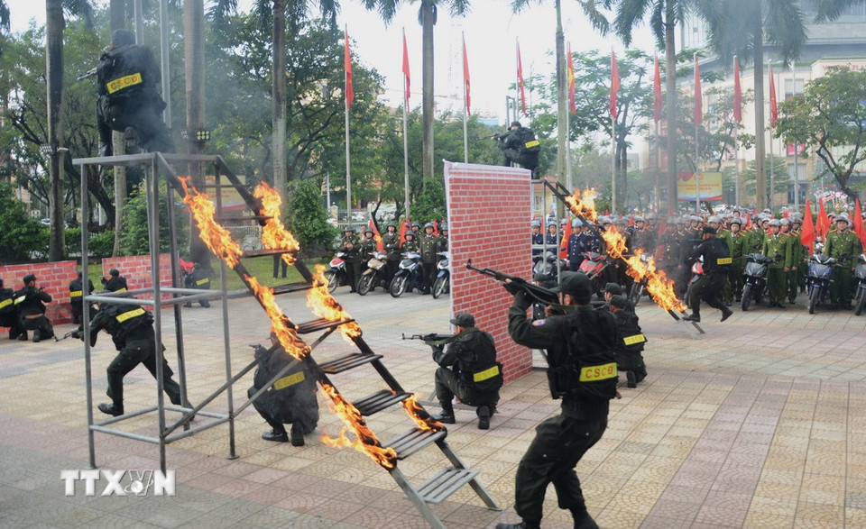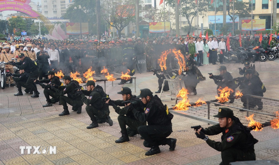 Diễn tập tấn công, trấn áp tội phạm tại lễ ra quân. (Ảnh: Văn Dũng/TTXVN)