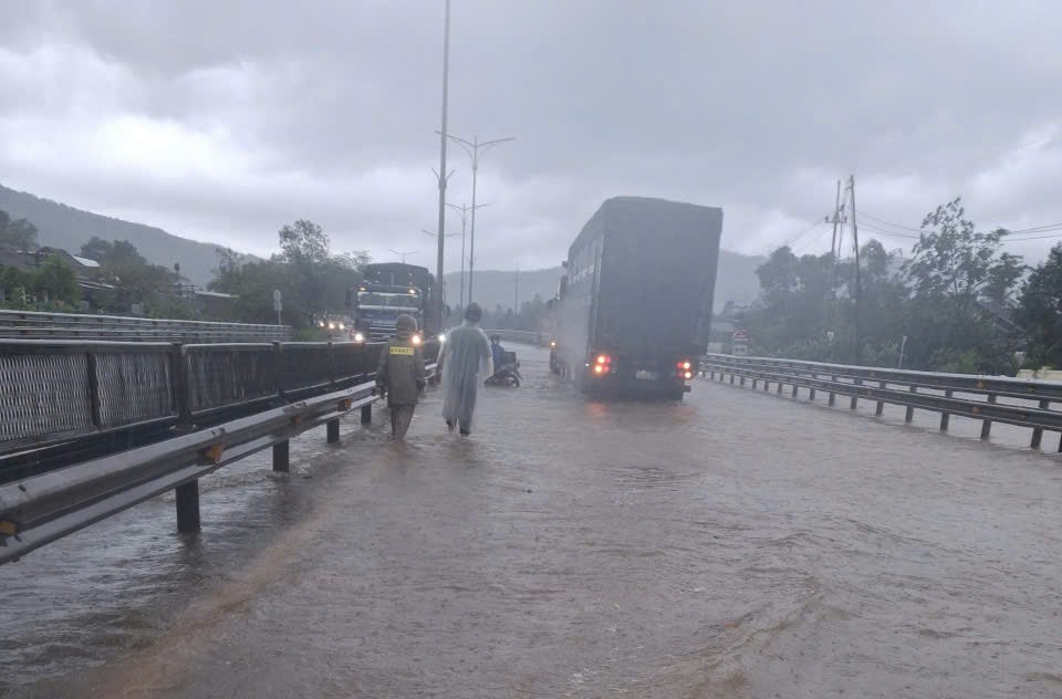 Tuyến đường quốc lộ 1 qua địa bàn xã Phú Lộc bị ngập khoảng 20cm.