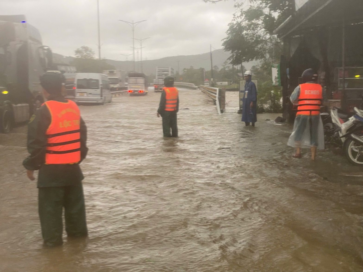 Lực lượng chức năng trúc trực trên Quốc lộ 1A đoạn qua xã Phú Lộc hướng dẫn phương tiện qua lại đoạn ngập.