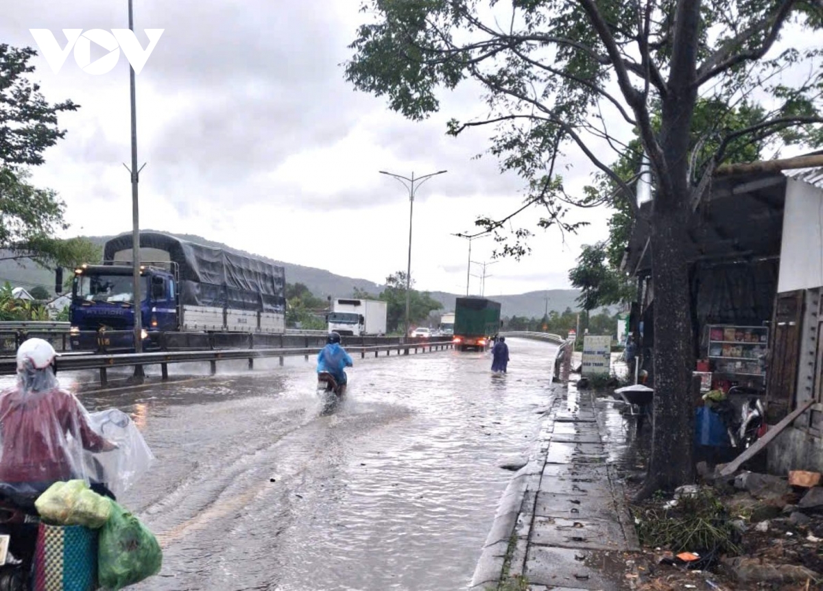 Quốc lộ 1A qua địa bàn xã Phú Lộc, thành phố Huế bị ngập khiến việc đi lại khó khăn