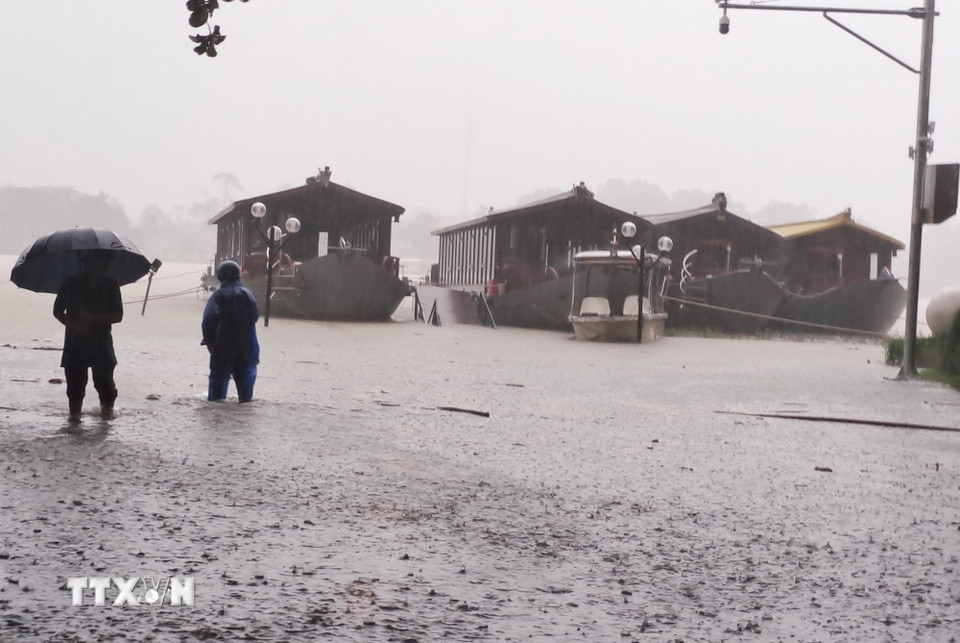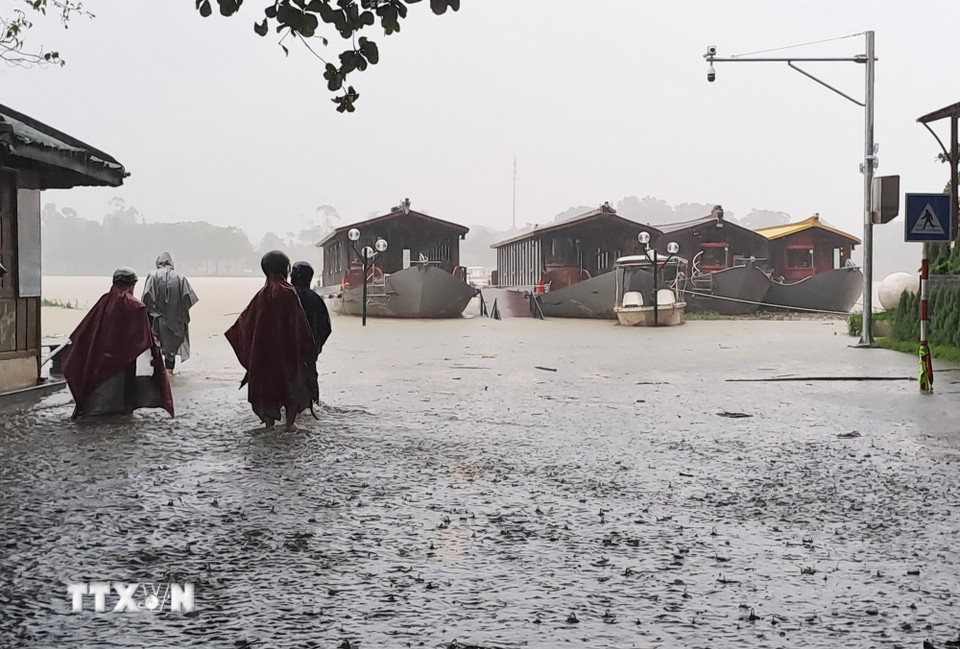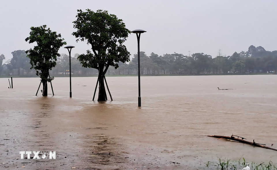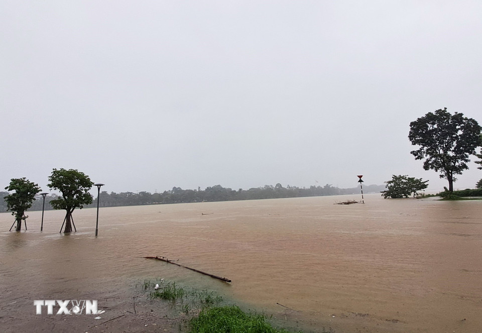 Lũ lên trên báo động 2 gây ngập ven bờ Nam sông Hương, thành phố Huế. (Ảnh: Nguyên Lý/TTXVN)
