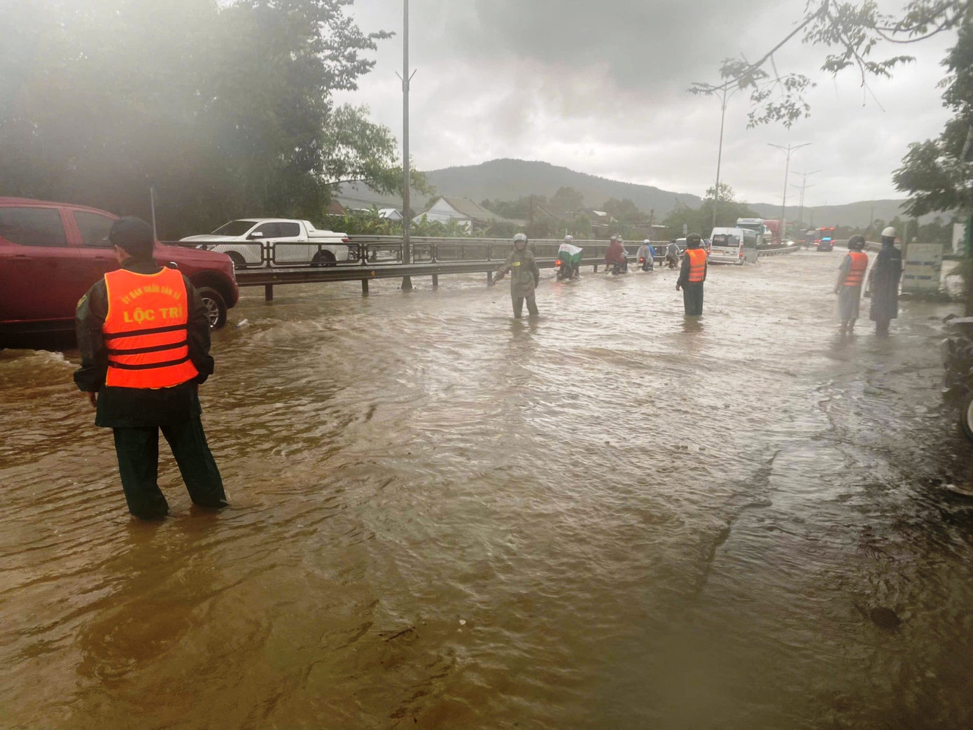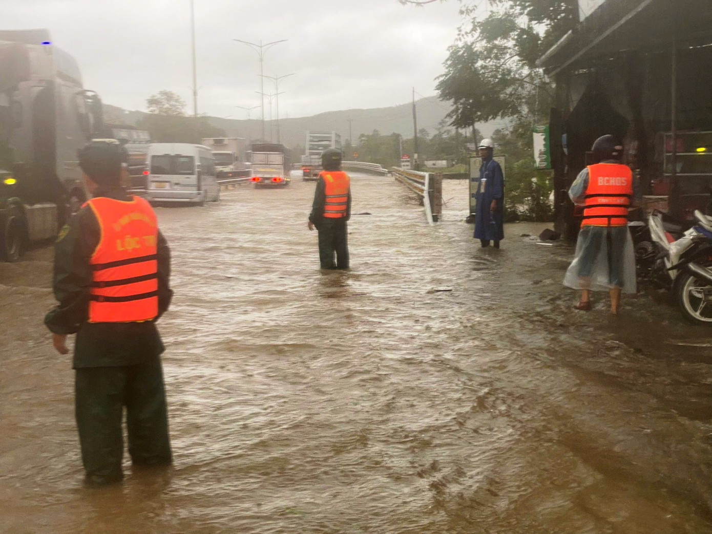 Cảnh sát giao thông phối hợp lực lượng chức năng xã Phú Lộc điều tiết, đảm bảo an toàn giao thông tại các đoạn Quốc lộ 1 bị ngập lụt. Ảnh PLNM
