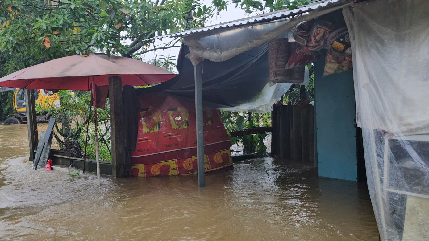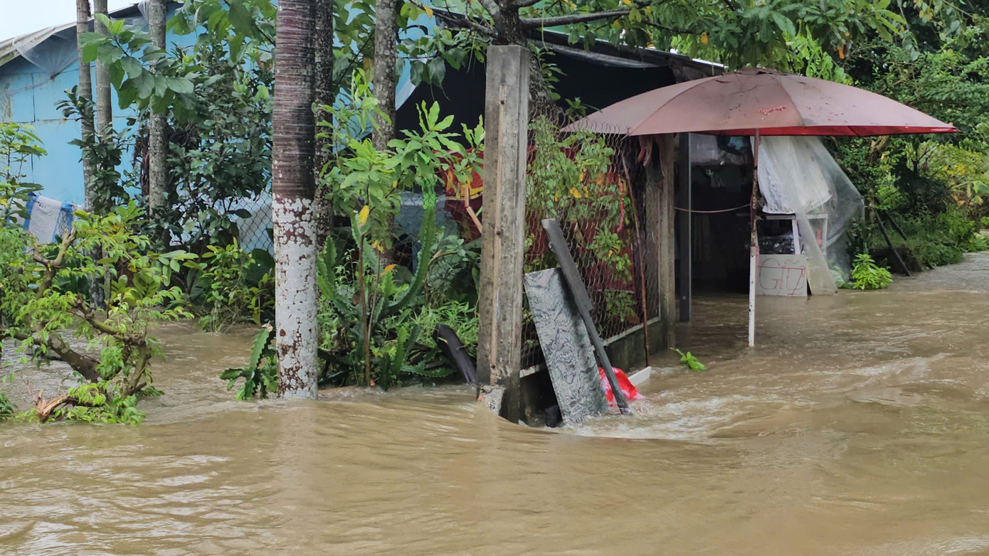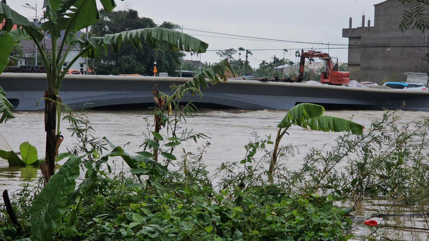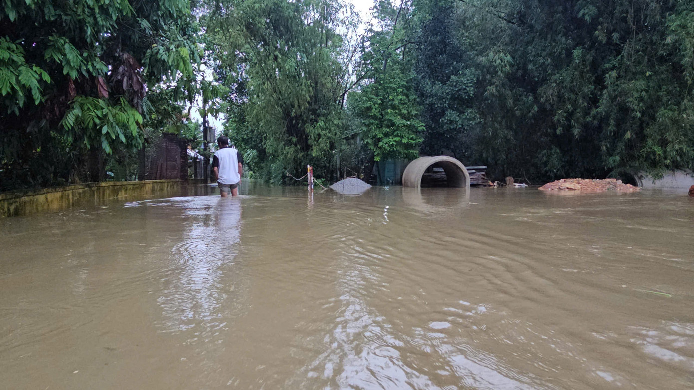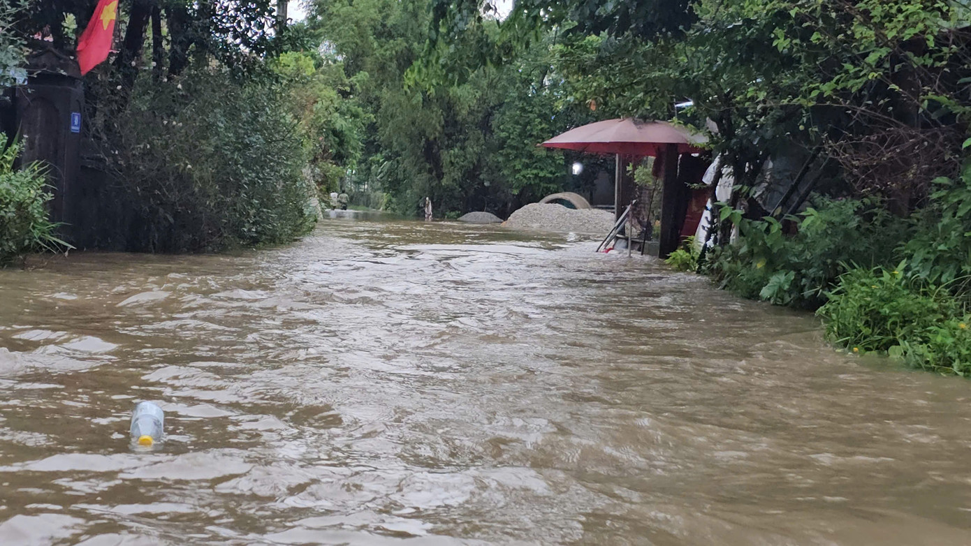 Nước chảy xiết trên mặt đường, gây nguy hiểm đi lại.