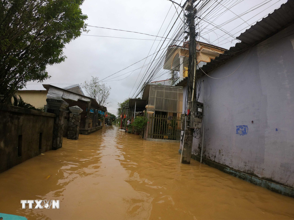Một góc ngõ dân cư Tổ dân phố Phú Khê, phường Dương Nỗ (Huế) vẫn ngập trong lũ. (Ảnh: Kha Phạm/TTXVN)\