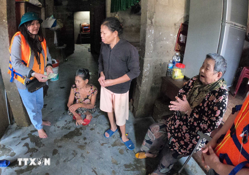 Nhà hảo tâm tặng quà gia đình bà Nguyễn Thị Khế, khóm 18, tổ dân phố Phú Khê, phường Dương Nỗ (Huế), đặc biệt khó khăn, vẫn ngập trong lũ. (Ảnh: Kha Phạm/TTXVN)