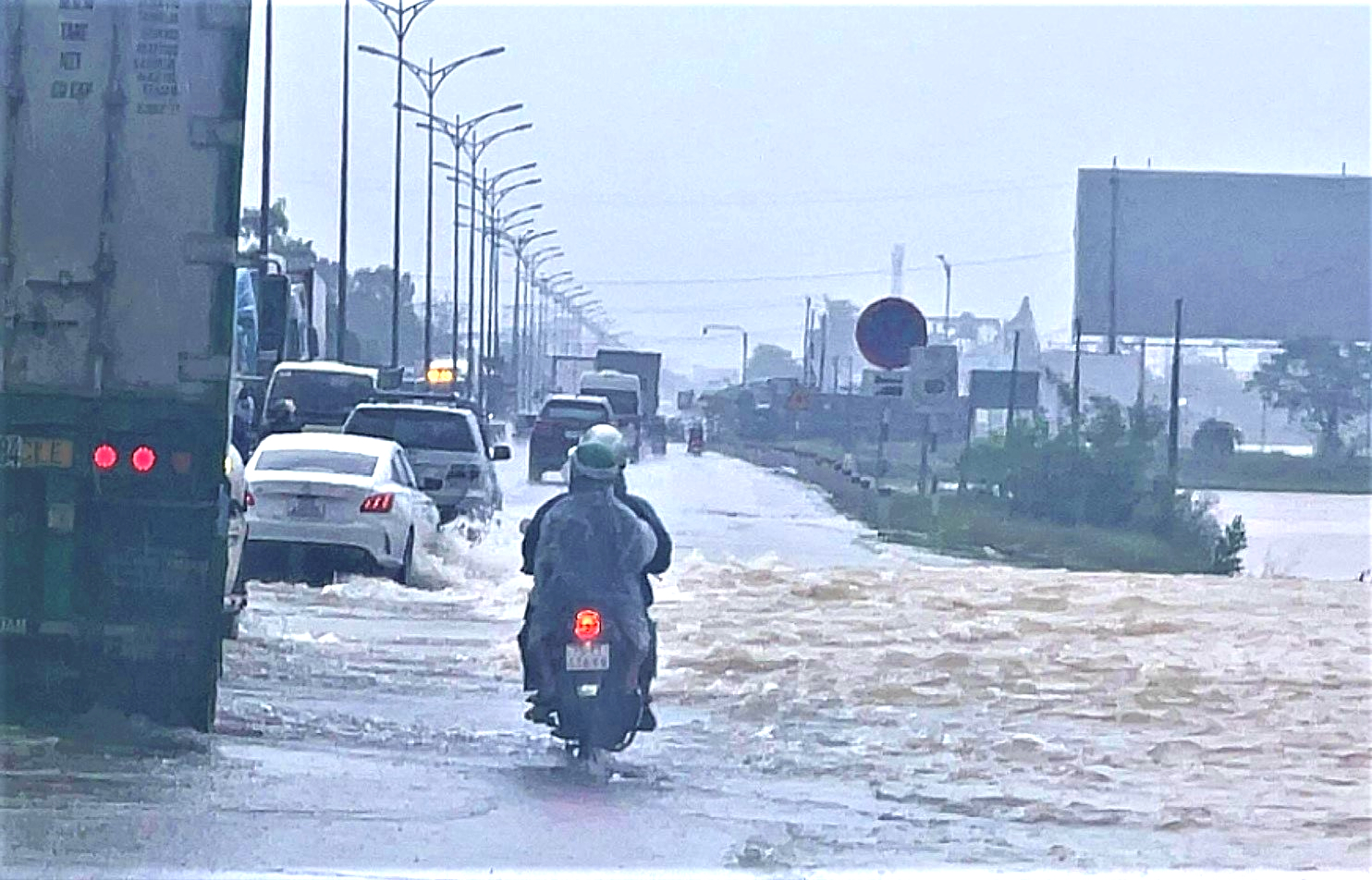 Quốc lộ 1 tại Km 808+300 đoạn qua phường Hương Trà, TP Huế bị ngập sâu.