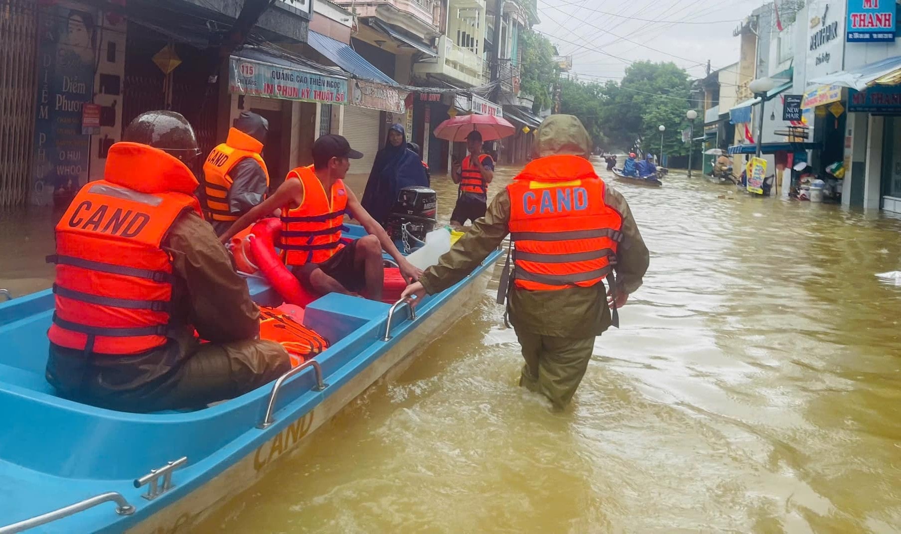 Lực lượng cứu hộ Huế vượt lũ trợ giúp người dân. Ảnh: Công an Huế cung cấp