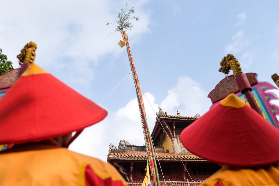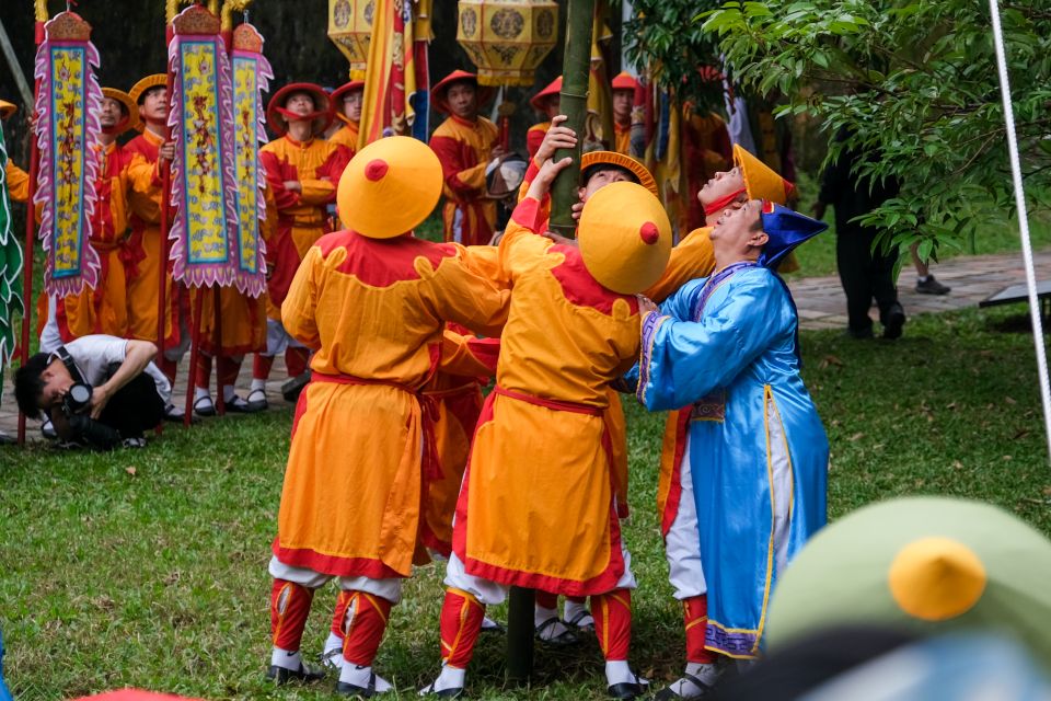 Lễ dựng nêu được tiến hành theo đúng nghi thức xưa, với sự tham gia của đội lính vệ, ban nghi lễ và dàn nhã nhạc cung đình. Cây nêu bằng tre già, cao khoảng 15 mét, được rước trang trọng từ cửa Hiển Nhơn, men theo trục trung tâm Hoàng cung, đi qua khu vực điện Thái Hòa (nơi vua từng thiết triều) trước khi an vị tại Thế Miếu – nơi thờ các vị vua triều Nguyễn. Toàn bộ quá trình diễn ra trong không gian trang nghiêm, hòa cùng âm thanh trầm mặc của các bài tiểu nhạc cung đình.