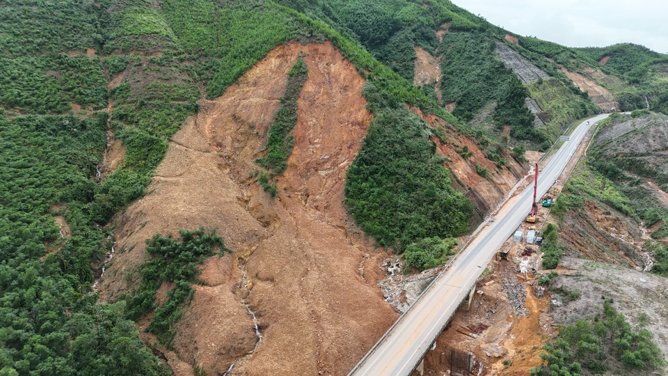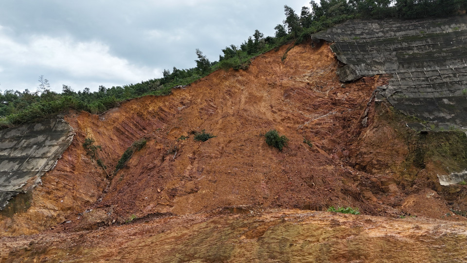 Đoạn đường dẫn từ Cao tốc La Sơ-Túy Loan đến Tỉnh lộ 14B xảy ra sạt lở nghiêm trọng. (Ảnh: Mai Trang/TTXVN)