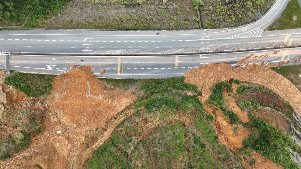 Taluy dương trên Cao tốc La Sơn-Túy Loan bị sạt lở nghiêm trọng. (Ảnh: Mai Trang/TTXVN)